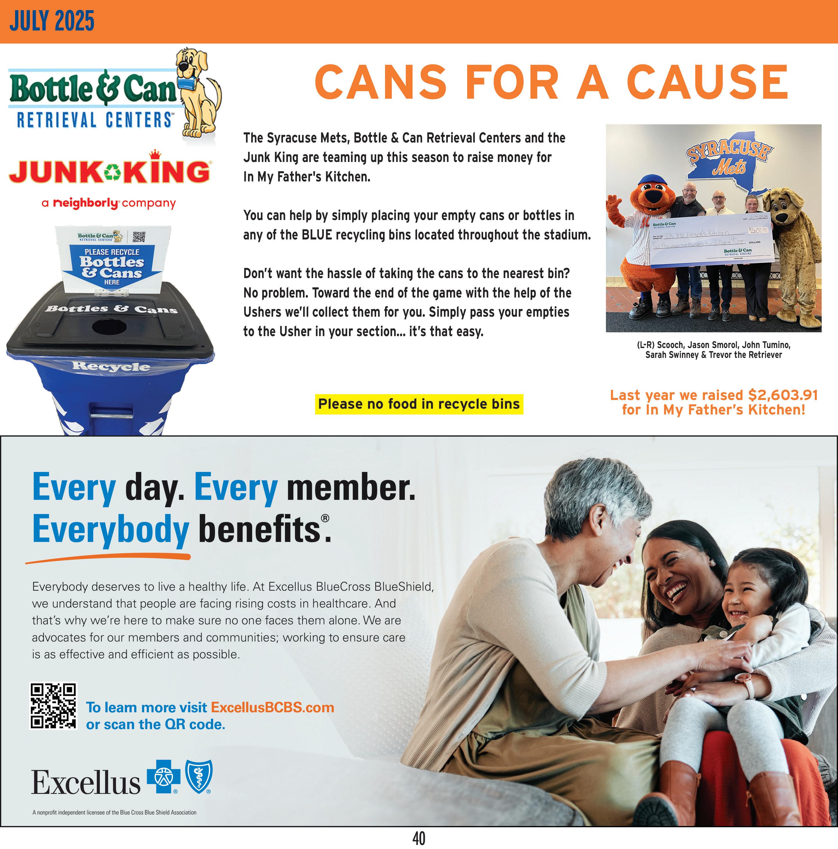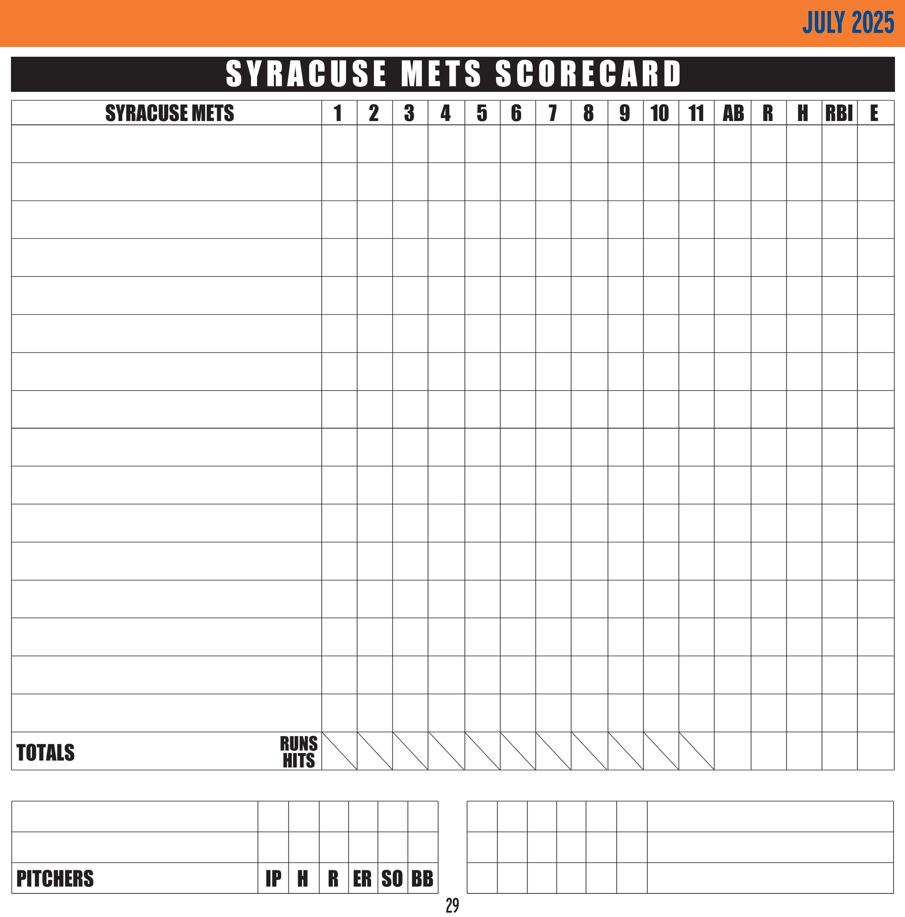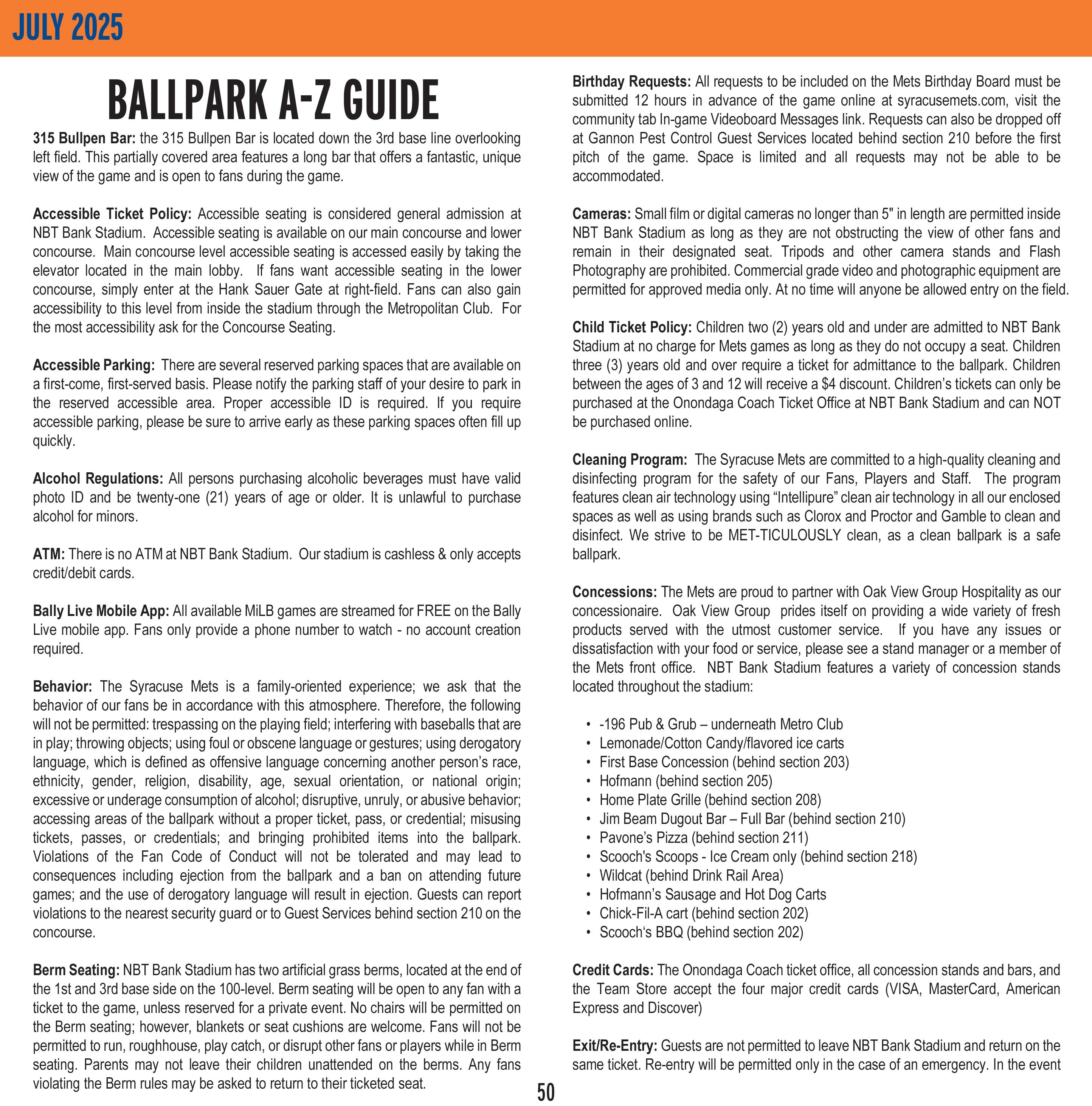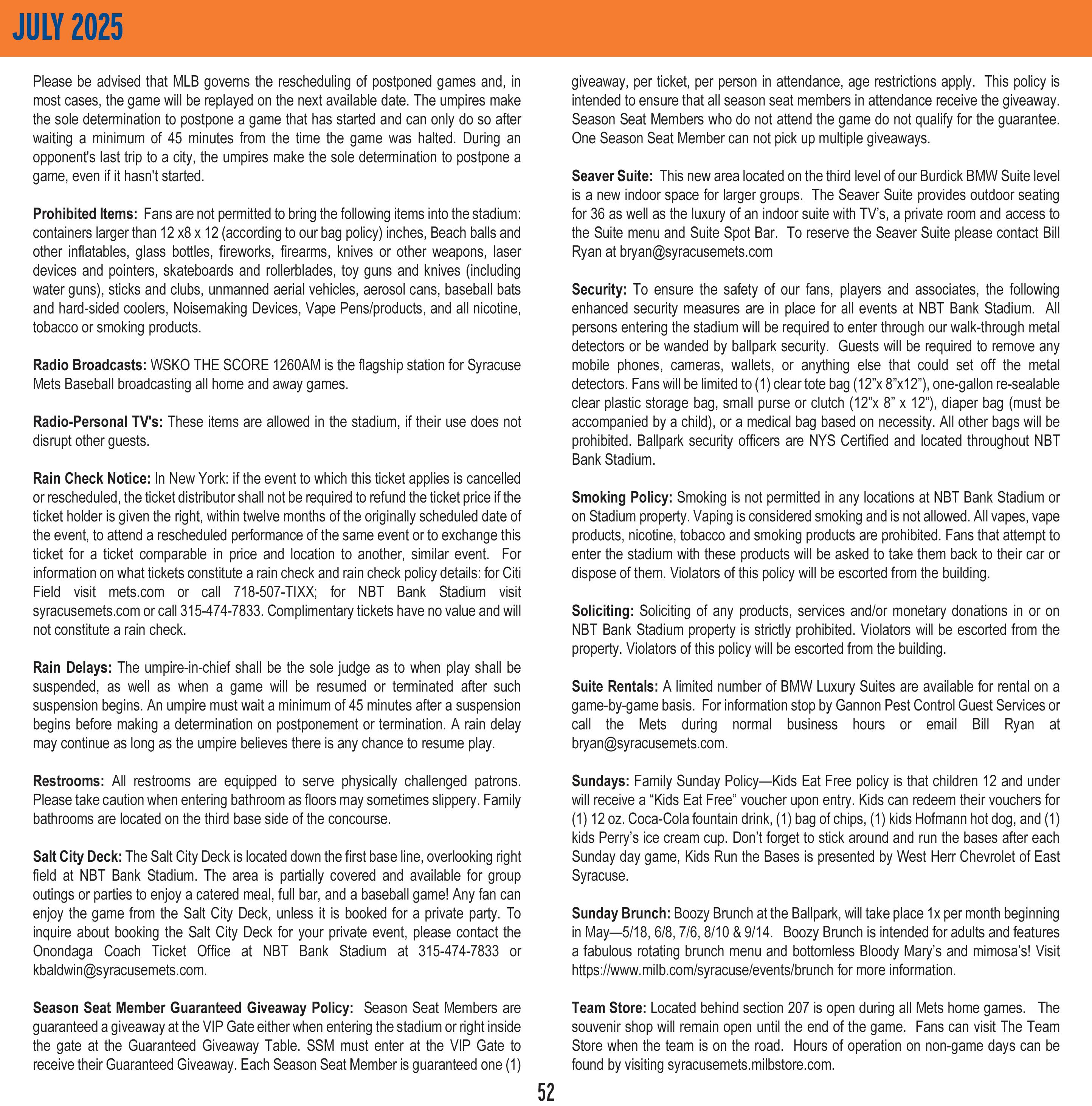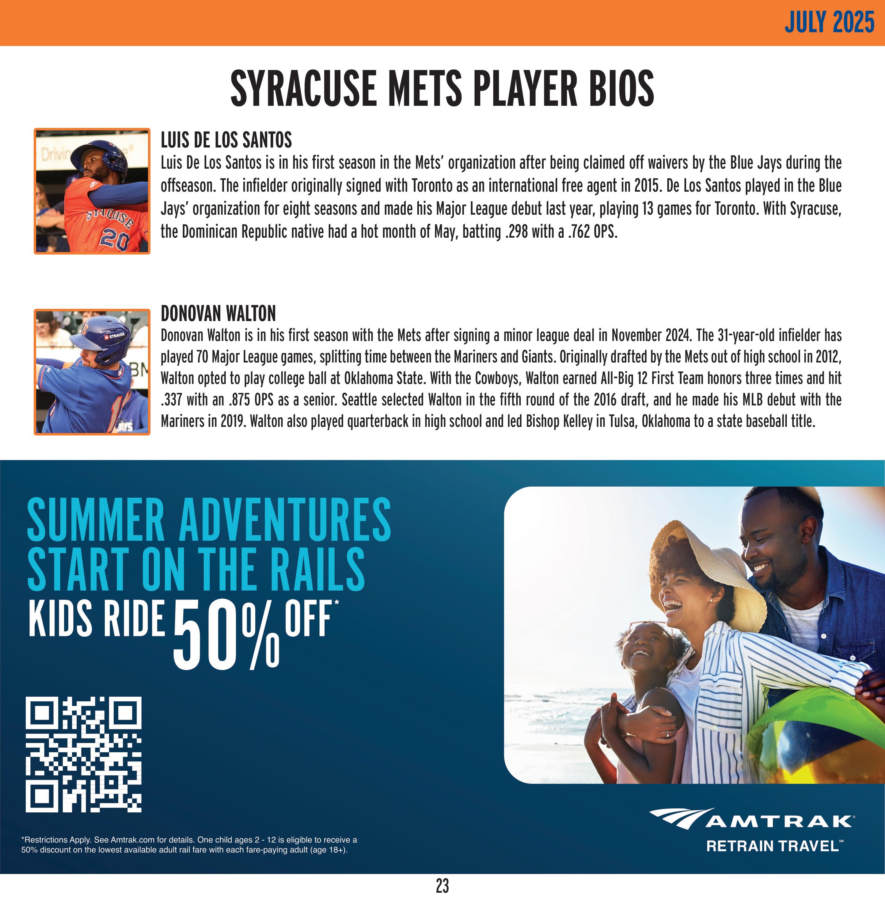 Welcome to the Syracuse Mets July 2025 Gameday Program! Dive into the ultimate fan experience with our comprehensive guide. Inside, you'll find player bios that highlight some of the stars of our team, exciting promotional information to keep you in the loop on all the fun events, and the complete 2025 schedule so you never miss a game. Our A-Z guide covers everything you need to know about the stadium and game day logistics. Plus, keep track of the action with our scorecard and much more.