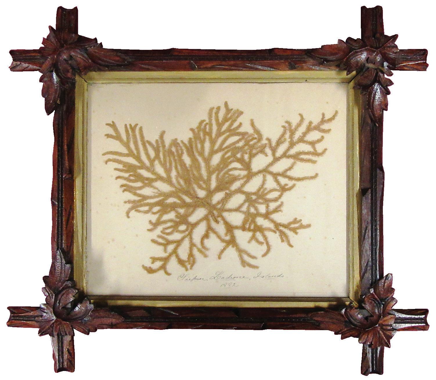 Figure 2. Adeline Heppingstone, framed botanical specimens, 1882. NBWM 2019.79.31. Pair of fern leaves from the Bonin Islands and a single unidentified specimen, possibly Liagora from Saipan, Ladrone Islands, 1882 (Marianas Islands). Adeline Heppingstone is said to have collected these specimens while onboard the bark Fleetwing
