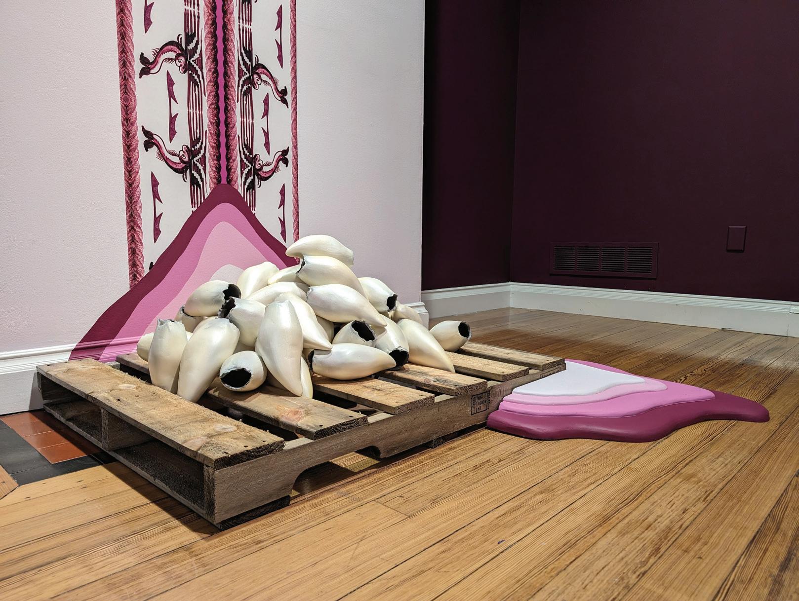 Figure 1. Courtney M. Leonard (Shinnecock, b. 1980), BREACH #2 (part of a limited series started in 2015 marking the death of one whale), 2024. Ceramic sperm whale teeth and wooden pallet, courtesy of the artist. Installed at the New Bedford Whaling Museum.