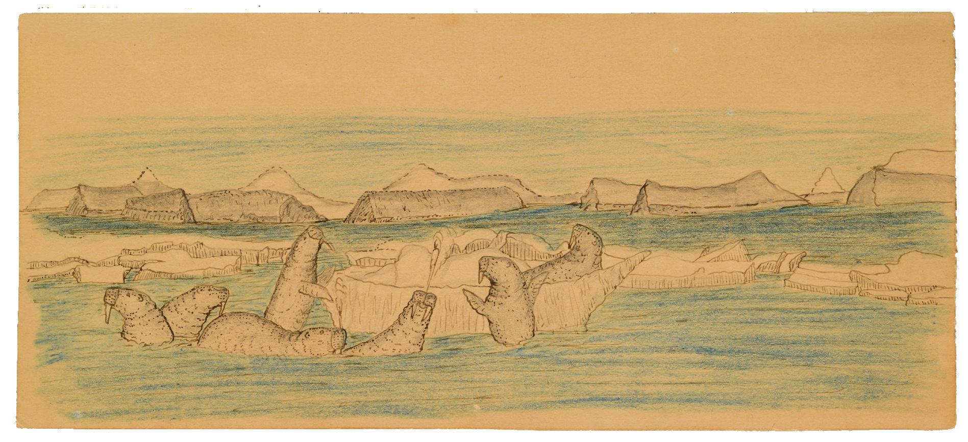 Figure 1. Iñupiaq maker once known (Inuit nunaat), possibly Port Clarence Mission School, Walruses, ca. 1890. Pencil and ink on paper, 3 1/2 x 7 7/8 in., New Bedford Whaling Museum, 1914.35.14.