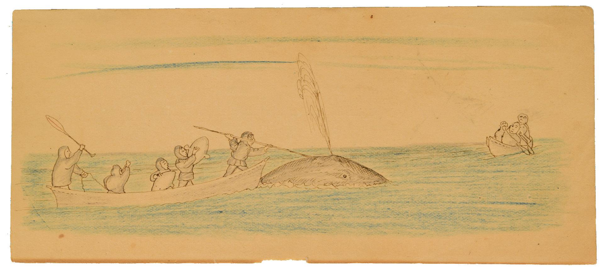 Figure 2. Iñupiaq maker once known (Inuit nunaat), possibly Port Clarence Mission School, Whale Hunt, ca. 1890. Pencil and ink on paper, 3 1/2 x 7 7/8 in., New Bedford Whaling Museum, 1914.35.13.