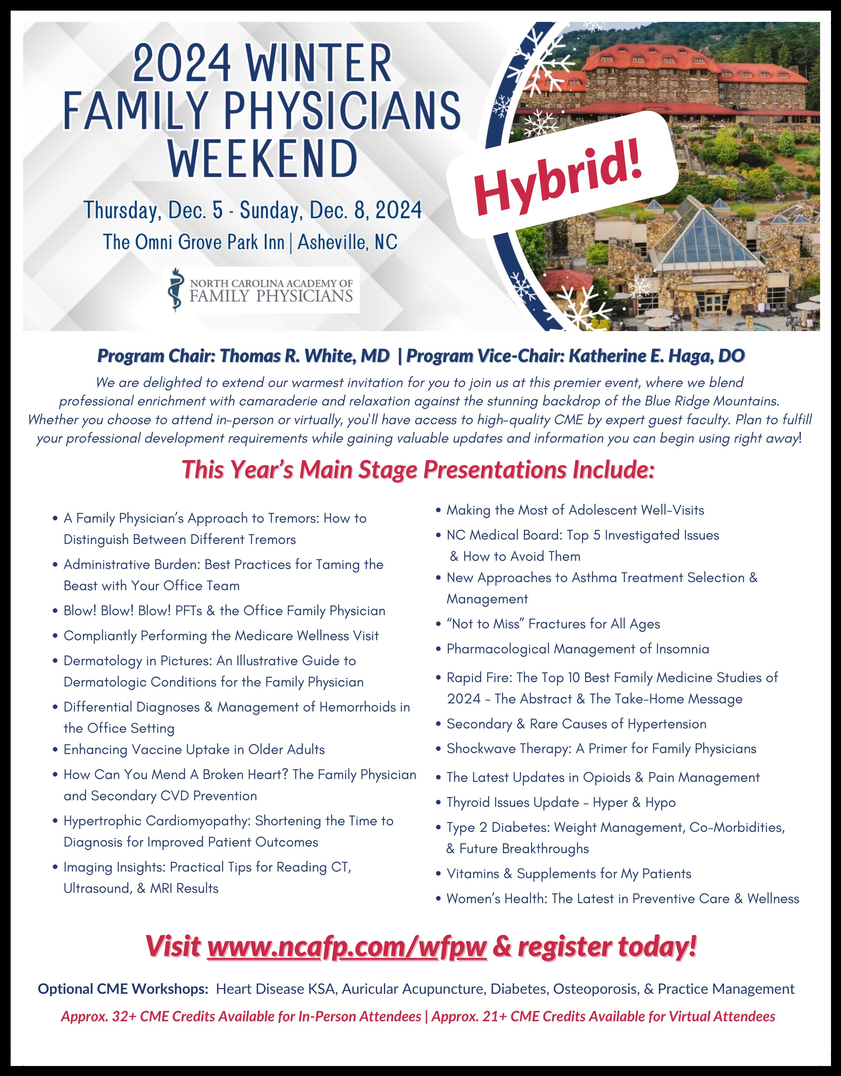 The 2024 Winter Family Physicians Weekend, dedicated to advancing clinical knowledge, fostering camaraderie, and celebrating the vital work of family physicians, promises once again to be your favorite CME opportunity of the year! This year, we’ve introduced a hybrid format, offering you the convenience of attending all the terrific and timely mainstage lectures, whether in-person or virtually. Mark your calendars now for Thursday, Dec. 5 – Sunday, Dec. 8, 2024, and begin making your plans to join us in Asheville at the Omni Grove Park Inn (GPI). Or reserve your favorite seat in your own home for a weekend of comprehensive virtual sessions you will not want to miss.