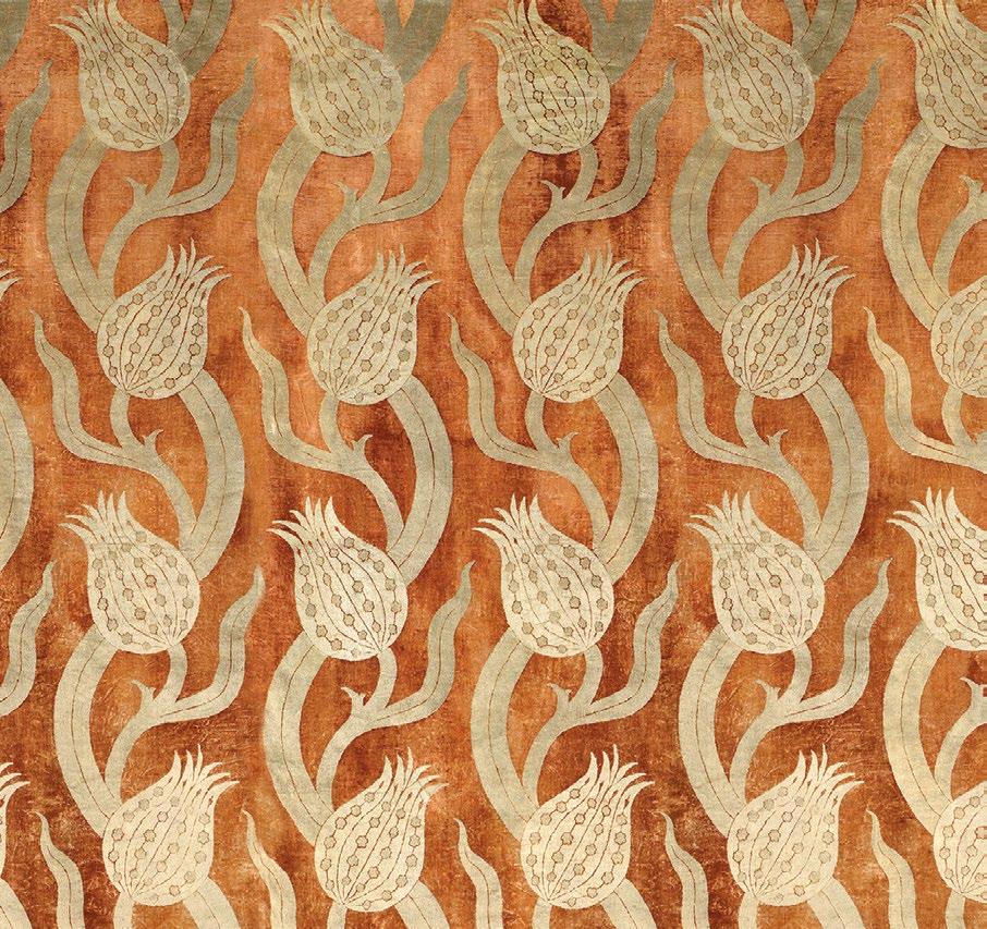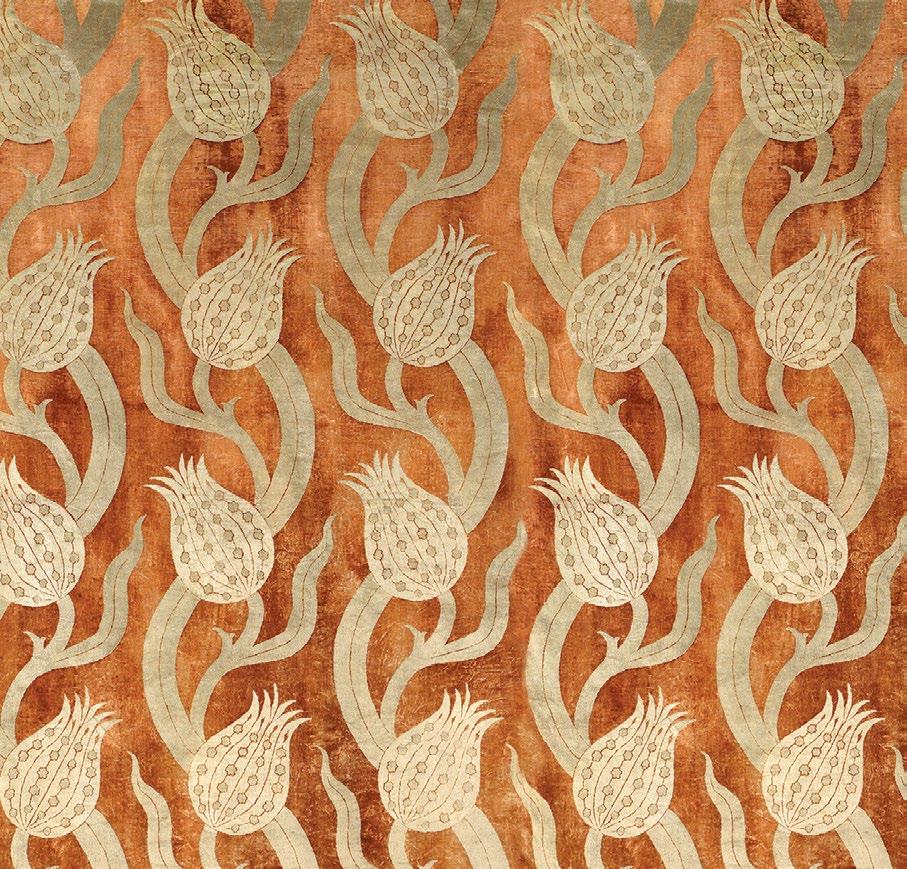 The original application of a splendid fragment of crimson velvet cloth (page 6, top right) in late 15th-century Venice is unknown. The ogival layout created by velvet pile bands encompassing composite blossoms manifests the influence of Ottoman art. However, velvet weavers in Bursa never produced designs in which the ogival framework so completely dominated the pattern.