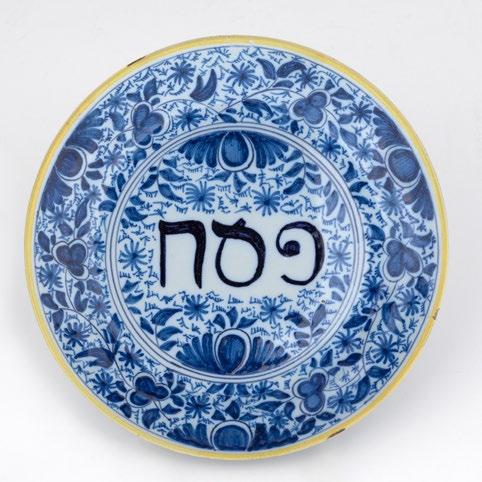 of the city. The finials were made in the mid-18th century by the artist Willem Hendrik Rosier (1707–1775), a Catholic and a member of the Amsterdam goldsmiths guild. The tiered, architectural forms with balustrades, arches, columns, and ornate embellishments exemplify the unique style of baroque Torah finials that originated in the Netherlands in the time of Rembrandt. Complementing the Delftware sabbath lamp in the exhibition, a large hanging silver sabbath lamp by Jacob Andreas Ebersbach (1745–1827) is a stunning neoclassical example of Judaica made for the Dutch home and a highlight of the gallery. And just last year, the NCMA added to the collection a blue-and-white Delftware plate by the De Klaauw factory. One of a known group of similar plates made in the Delft style with Hebrew inscriptions indicating major holidays and occasions, the plate is inscribed with the holiday of Passover (Pesach in Hebrew) and was likely intended as a holiday gift, either individually or as part of a set. Like the art and ceremonial objects featured in The Book of Esther in the Age of Rembrandt, the works in the Judaic Art Gallery bear witness to the dynamic dialogue between the Dutch and Jewish communities beginning in the 17th century and the importance of the age of Rembrandt in the evolution of Jewish ceremonial art.