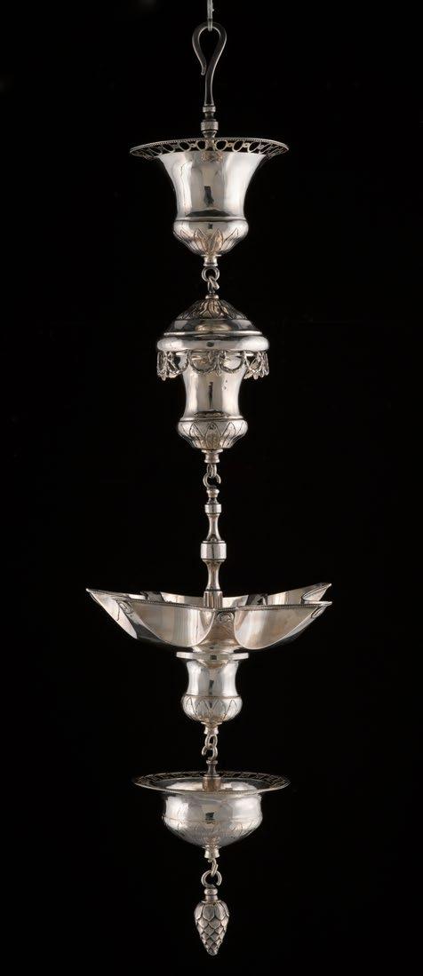 left to right Jacob Andreas Ebersbach, Sabbath and Festival Lamp, 1793, silver, H. 381/2 in., Purchased with funds from Lauri Union, Stanley Rosenzweig, and family in loving memory of Benjamin M. and E. Elizabeth Saslaw; Elizabeth Kanof Levine and Ronald Levine; Marion Meyer-Robboy and Stanley Robboy; Emily Kass and Charles Weinraub; and other Friends of the Judaic Art Gallery; Attributed to Willem Hendrik Rosier, Pair of Torah Finials, circa 1765, silver, brass, partly gilded, 165/8 × 51/2 in., Purchased with funds from Margaret and Douglas Abrams, Marion Meyer-Robboy and Stanley Robboy, Connie C. and Robert D. Shertz, Laura and David Brody, Joan and Kalman Cohen, David C. Falk Sr., Elizabeth Kanof Levine and Ronald Levine, and other Friends of the Judaic Art Gallery; De Klaauw Factory, Passover Plate, 18th C.?, earthenware and tin glaze, Diam. 87/8 × D. 13/16 in., Gift of Carol Vatz and Joel Rosch in memory of their parents, Betty and Benny Vatz and Bea and Maurice Rosch