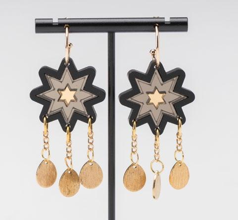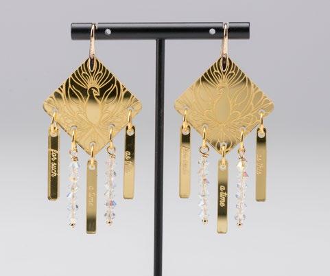 I've created four wearable designs inspired by the strength and story of Queen Esther. Earrings featuring the quote “If I perish, I perish” reference Esther’s resolve when she goes before King Ahasuerus uninvited. Another pair of earrings includes the quote “for such a time as this” and features a prominent engraving of a peacock symbolizing resilience, as demonstrated by Esther’s selfless effort to save the Jewish people in ancient Persia. Dainty hammered brass earrings topped with wire-wrapped amethyst in the shape of a bejeweled scepter represent the moment that the King held out his royal staff to Esther in favor. Amethyst both symbolizes royalty and is thought to protect the wearer. The design Candle-Lit Stars references the name Esther, meaning star, and mimics the dimness of Rembrandt’s paintings, often with light emanating from a single candlestick.