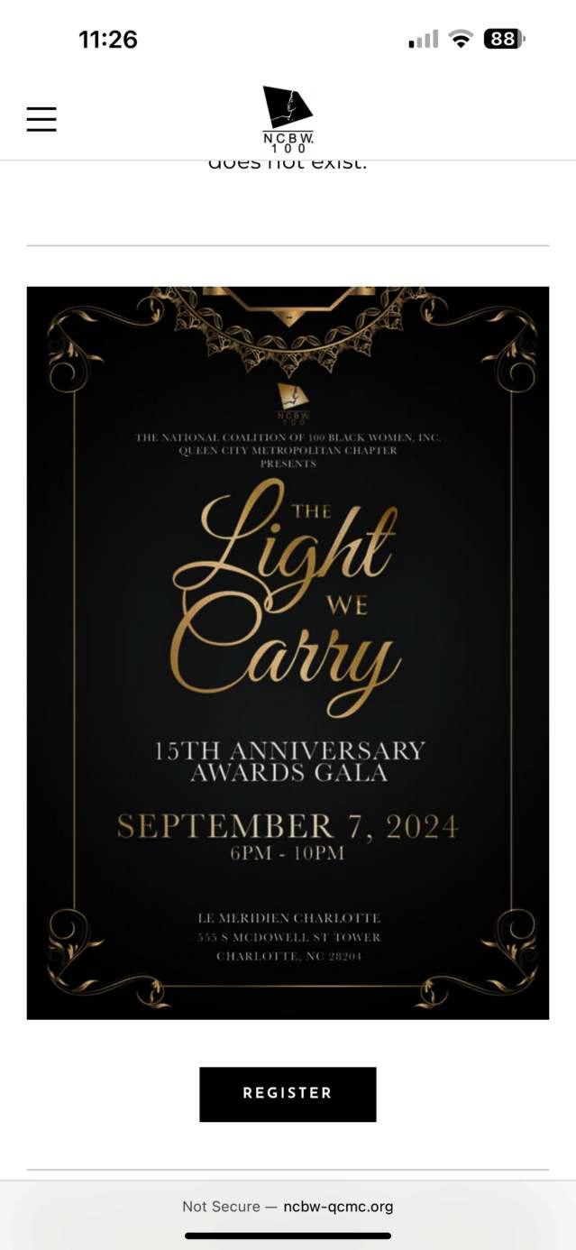 It is with great pride and profound gratitude that I warmly welcome you to The National Coalition of 100 Black Women, Inc., Queen City Metropolitan Chapter’s 15th Anniversary Fundraiser Gala, “The Light We Carry”.
