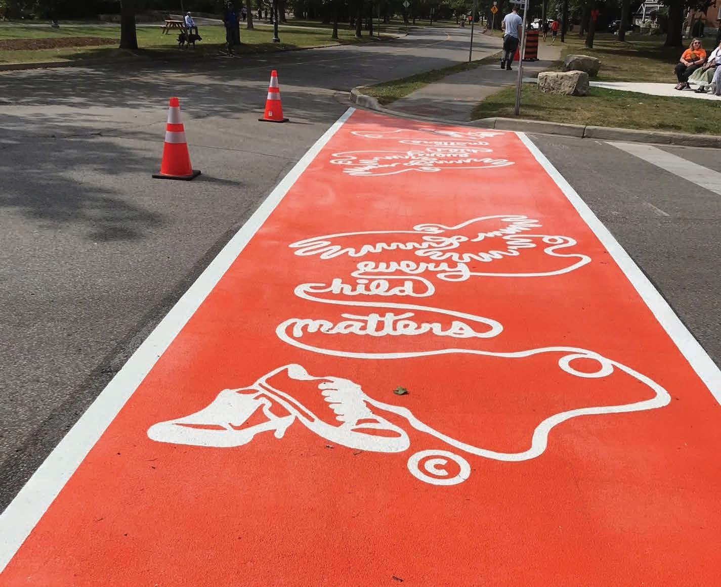 Public spaces across Canada increasingly feature “Every Child Matters” art installations, from short-term aerial art to bright orange crosswalks, that call attention to the racist and genocidal Indian Residential School system (see Figures 5 & 6). In 2013, Phyllis Webstad shared her powerful story about her new orange shirt being taken away on the first day of Residential School during the Truth and Reconciliation Commission testimonies. Since then, the “Every Child Matters” campaign has rallied Indigenous and nonIndigenous activists around renewed truth and reconciliation measures that address the legacy of ongoing Residential School trauma and the appalling abuse and loss of life that occurred at those institutions. To keep the matter at the forefront of our collective consciousness, community groups gather to paint bright orange commemorative and galvanizing works of art in public spaces. Non-profit organizations like the Orange Shirt Society supply grants for community groups to create “murals, mosaics, memorials, sidewalk designs, or other semipermanent installations that are highly visible and significant” (Orange Shirt Society, n.d., n.p.). Exposing the truth of this atrocity, painted larger than life for everyone to see, not only initiates a site of healing for survivors and the families of the lost, but also evokes an invitation for learning and conversation.