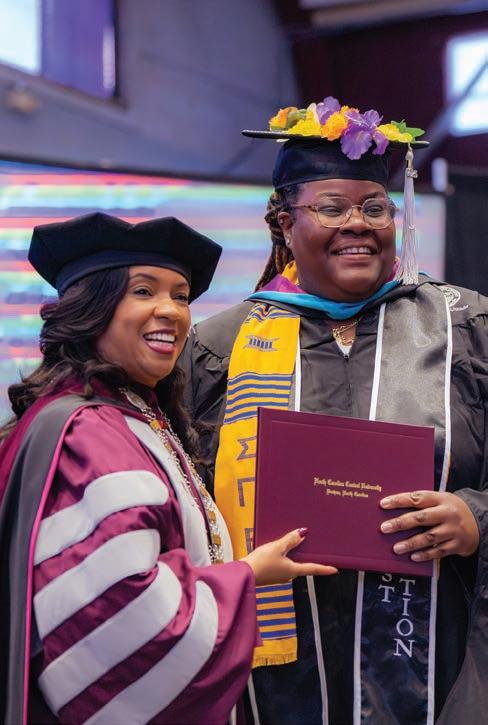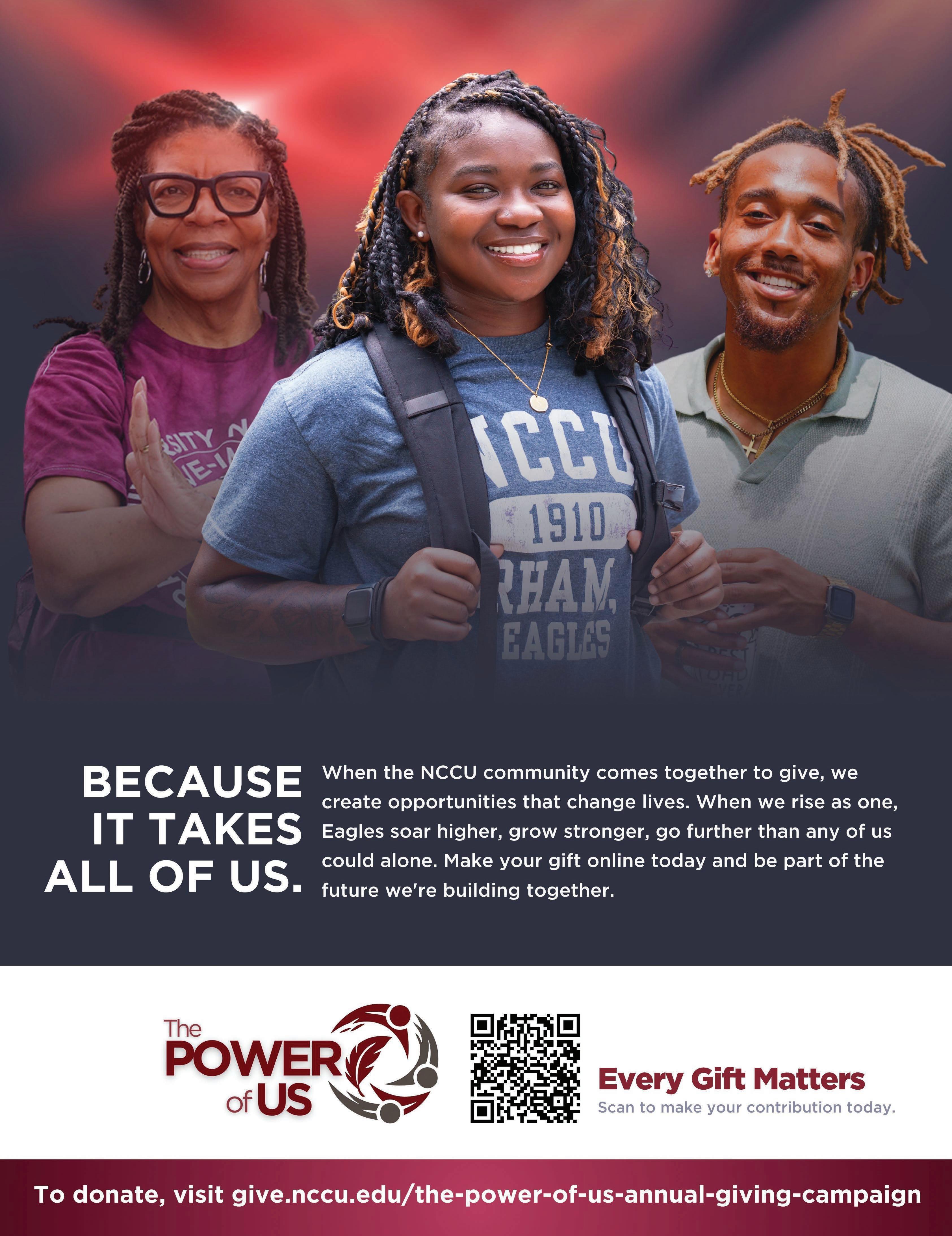 Please send address corrections to Advancement Services, Phone: 919-530-7399 / E-mail: rgallow7@nccu.edu or mail to 1801 Fayetteville Street, Durham, NC 27707. At a cost of $2.02 each, 10,000 copies of this public document was printed for a total of $20,201 in the Fall of 2025 and distributed to NCCU supporters and donors. NCCU is accredited by the Southern Association of Colleges and Schools Commission on Colleges to award baccalaureate, master’s, education specialist and doctoral degrees. Contact the SACSCOC at 1866 Southern Lane, Decatur, GA 30033-4097 or call 404-679-4500 for questions about the accreditation of NCCU. Copyright 2025, North Carolina Central University.
