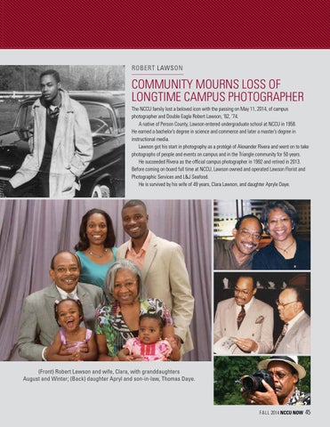 COMMUNITY MOURNS LOSS OF LONGTIME CAMPUS PHOTOGRAPHER The NCCU family lost a beloved icon with the passing on May 11, 2014, of campus photographer and Double Eagle Robert Lawson, ‘62, ‘74. A native of Person County, Lawson entered undergraduate school at NCCU in 1958. He earned a bachelor’s degree in science and commerce and later a master’s degree in instructional media. Lawson got his start in photography as a protégé of Alexander Rivera and went on to take photographs of people and events on campus and in the Triangle community for 50 years. He succeeded Rivera as the official campus photographer in 1992 and retired in 2013. Before coming on board full time at NCCU, Lawson owned and operated Lawson Florist and Photographic Services and L&J Seafood. He is survived by his wife of 49 years, Clara Lawson, and daughter Apryle Daye.