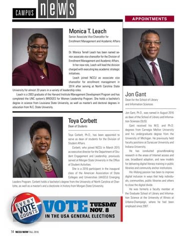 Monica T. Leach Senior Associate Vice Chancellor for Enrollment Management and Academic Affairs Dr. Monica Terrell Leach has been named senior associate vice chancellor for the Division of Enrollment Management and Academic Affairs. In her new role, Leach will lead the division charged with executing key academic strategic initiatives. Leach joined NCCU as associate vice chancellor for enrollment management in 2014 after serving at North Carolina State University for almost 20 years in a variety of leadership roles. Leach is a 2003 graduate of the Harvard Institute Management Development Program and has completed the UNC system’s BRIDGES for Women Leadership Program. She holds a bachelor’s degree in science from Louisiana State University, as well as master’s and doctoral degrees in education from N.C. State University.