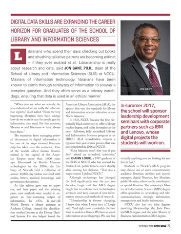 DIGITAL DATA SKILLS ARE EXPANDING THE CAREER HORIZON FOR GRADUATES OF THE SCHOOL OF LIBRARY AND INFORMATION SCIENCES ibrarians who spend their days checking out books and shushing talkative patrons are becoming extinct – if they ever existed at all. Librarianship is really about research and data, said JON GANT, PH.D., dean of the School of Library and Information Sciences (SLIS) at NCCU. Masters of information technology, librarians have been known to comb through terabytes of information to answer a complex question. And they often serve as a privacy watchdogs, ensuring that data is used in an ethical manner. “When you see what we actually do, you understand we are really the information experts,” Gant added. “From the very beginning, librarians have been asking: how do we make it easy for people get the information they need. For that purpose, libraries – and librarians – have always been there.” The transition from managing printed documents to digital information is but one of the steps forward librarianship has taken over the centuries. One of the world’s oldest known libraries existed in the capital of the Assyrian Empire more than 3,000 years ago. Discovered by British Museum archeologists in the 1850s, the Library of Nineveh held a collection of almost 30,000 clay tablets inscribed with stories, letters, medical knowledge and government documents. As clay tablets gave way to papyrus, and later paper and the printing press, new methods were needed to organize an ever-increasing output of information. In 1876, 21-year-old Melvil Dewey, a library assistant at Amherst College, created the classification method known as the Dewey Decimal System. He also helped found the