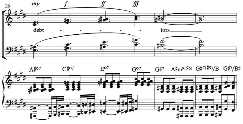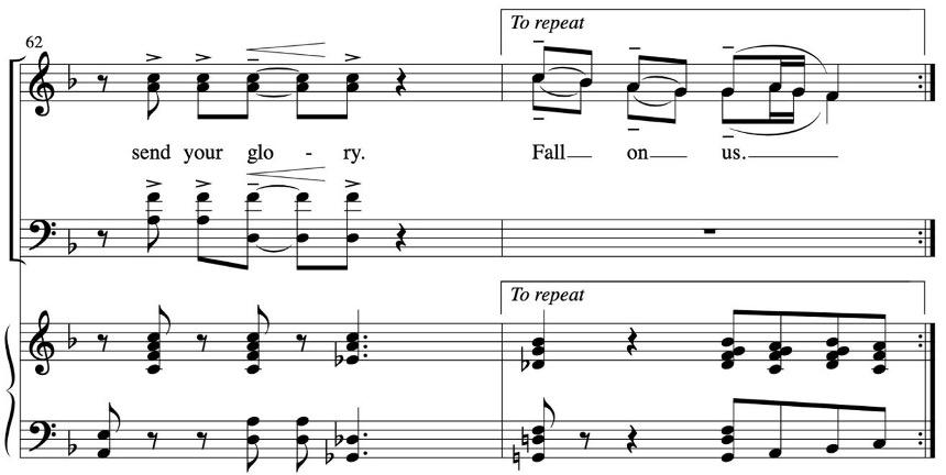 The choir follows this spiritual with a contrasted selection in William Dawson’s up-tempo and lively setting of Ain’-a That Good News! In this arrangement, Dawson fragments the melodic line and fills in each fragment with a range of articulation and dynamic markings. 7 These markings are executed to the finest detail. The conclusion of the piece features a final unfragmented iteration of the melody which serves as a brilliant climax to this cheerful proclamation.