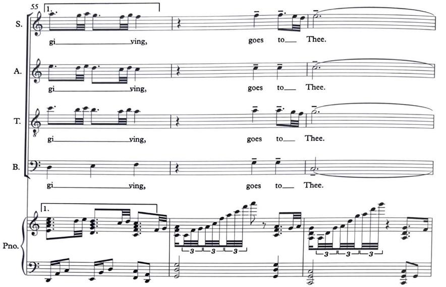 midway through the work guides us away from the previous dense harmonic texture. The end of the piece results in a subtle resolution that represents the end of the enlightenment journey. Both orchestra and chorus maintain flexibility with resonance and gradual dynamic markings. There is a constant connection between all moving and sustained melodies, which also pulls on heartstrings.