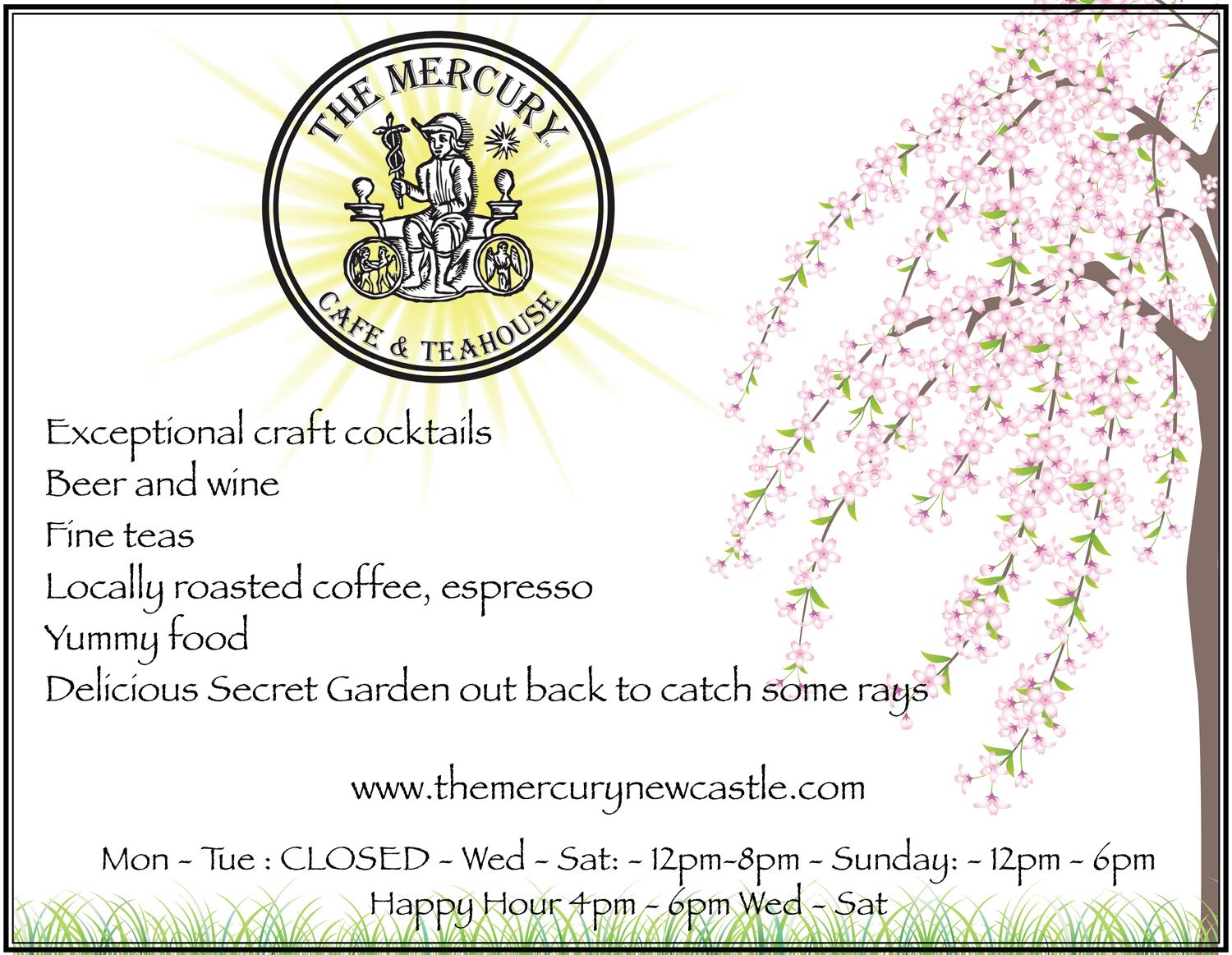 206 Delaware Street. Sit, Sip and Relax www.themercurynewcastle.com Wed. – Sat. 12:00 – 8:00 p.m. Sin. 12:00 –6:00 p.m. (check their website for special hours.)