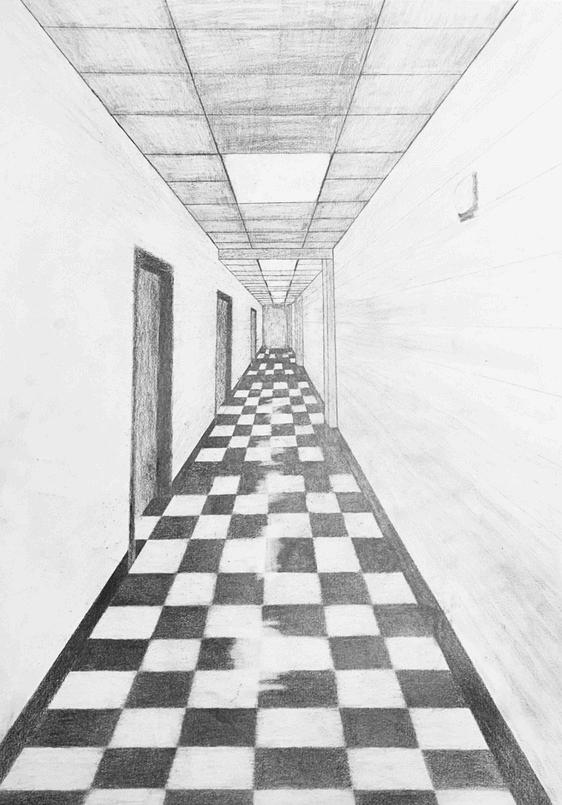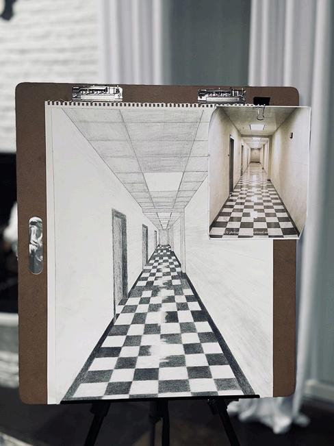 At Nassau Community College, creativity continues to thrive as students explore different forms of artistic expression. This graphite drawing, created by Khasim Plowden, titled A Study in Perspective, captures the illusion of depth through precise use of one point perspective and shading The work features a checkered hallway that leads the viewer’s eye toward a vanishing point, creating a strong sense of movement and dimension.