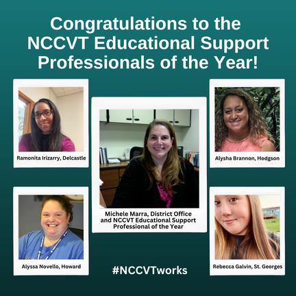 EachyeartheStateofDelawaresponsorsawardceremoniestohonor teachers,behavioralhealthspecialists,andeducationalsupport professionals.HereareNCCVT'snomineesandwinnersfor2023-2024.