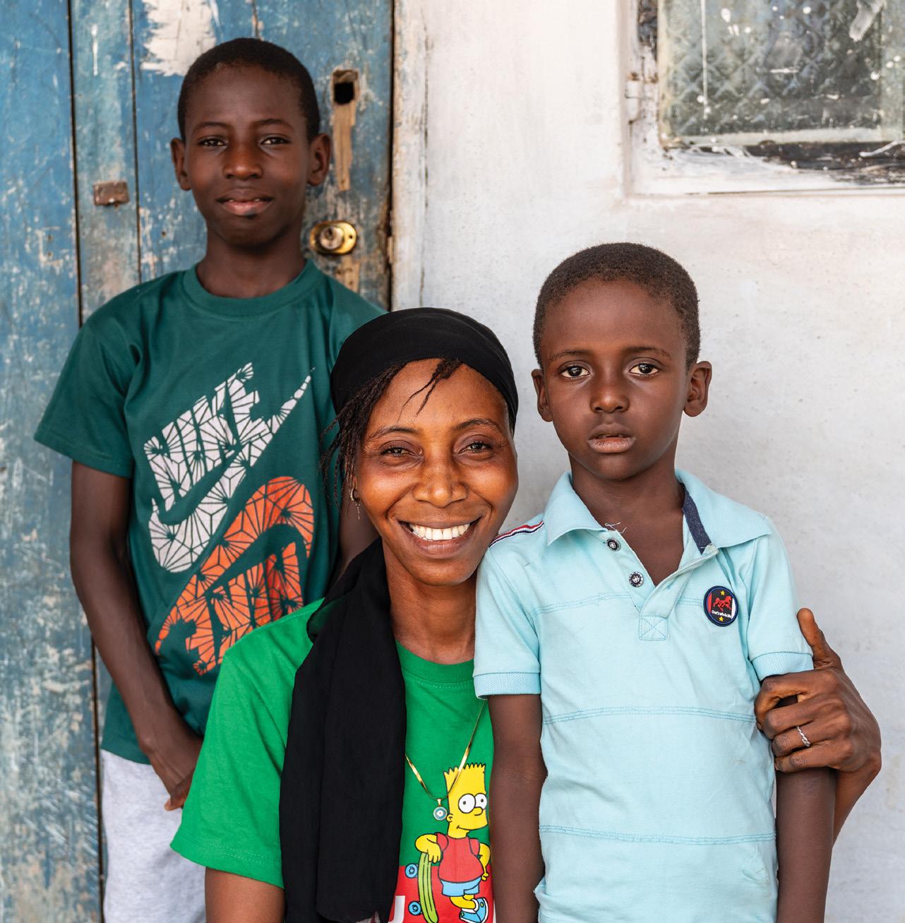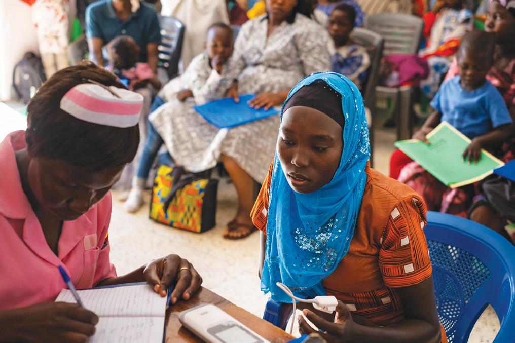 Above: Salimatu Sesay, shown with sons Abubakarr (left) and Alusine, relocated her family five hours to Koidu, Sierra Leone, to be close to the PEN-Plus clinic that diagnosed her rheumatic heart disease. Right: Namazzi Mercy, a medical intern, takes the blood pressure of 11-year-old Lubwama Jackson, who receives treatment for his sickle cell disease at the PEN-Plus clinic in Nakaseke, Uganda.