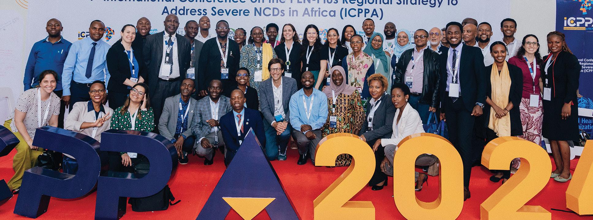 NCDI POVERTY NETWORK members gather on the photo stage at the first International Conference on PEN-Plus in Africa, hosted by the World Health Organization Regional Office for Africa in Dar es Salaam, Tanzania, in April 2024.