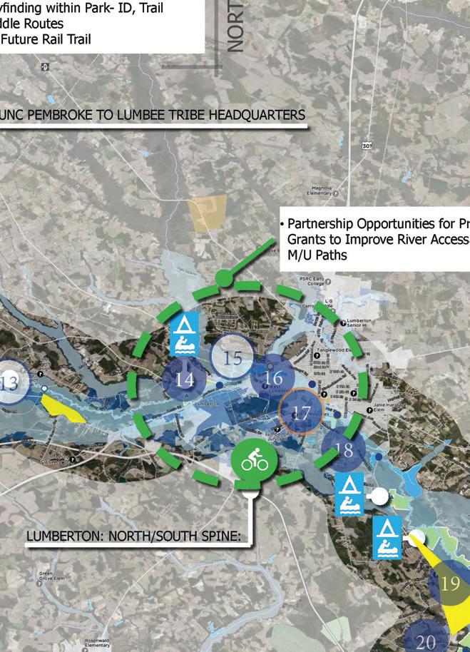 5. Increase recreation access and connectivity, and enhance the unique existing opportunities. Incorporate hiking trails and elevate unique recreation activities such as short- and long-distance paddle trails Provide overnight accommodation at paddle-in and family campgrounds at both Princess Ann and Chalk Banks for visitors. The City of Lumberton maintains an extensive walking and biking trail lying atop the protective levee, which passes immediately adjacent to the Scottish packing site. This levee trail connects to both Luther Britt Park (complete with two lakes, fishing, boating and beach access) and our historic downtown. Also, the City is currently working with NCWRC to establish a canoe/kayak launch and fishing pier just upstream at Stevens Park. In addition, we are partnered with NCDOT to create a bike/ped access across the Lumber River at 5th Street in order to further connect the levee trail to our newly installed Downtown Riverwalk (Phase I). As you can see, the Scottish Packing site would play an integral role in linking all of these preexisting recreational opportunities together.