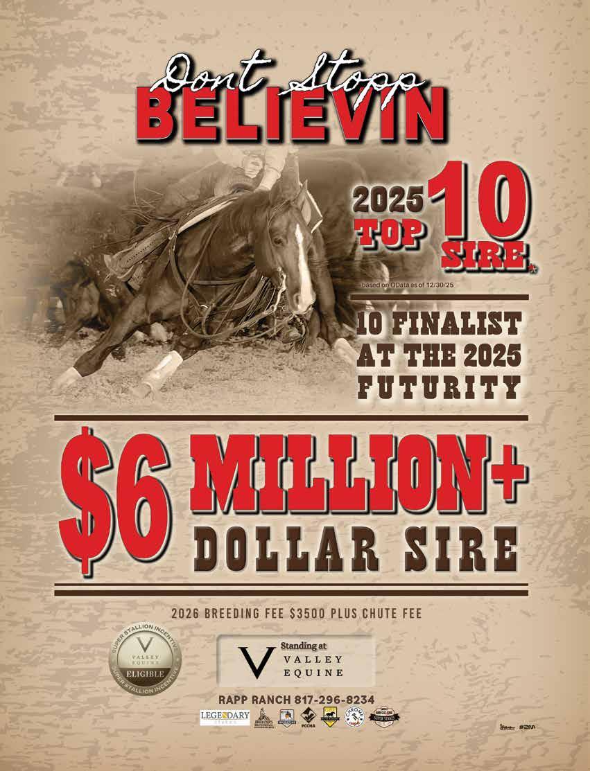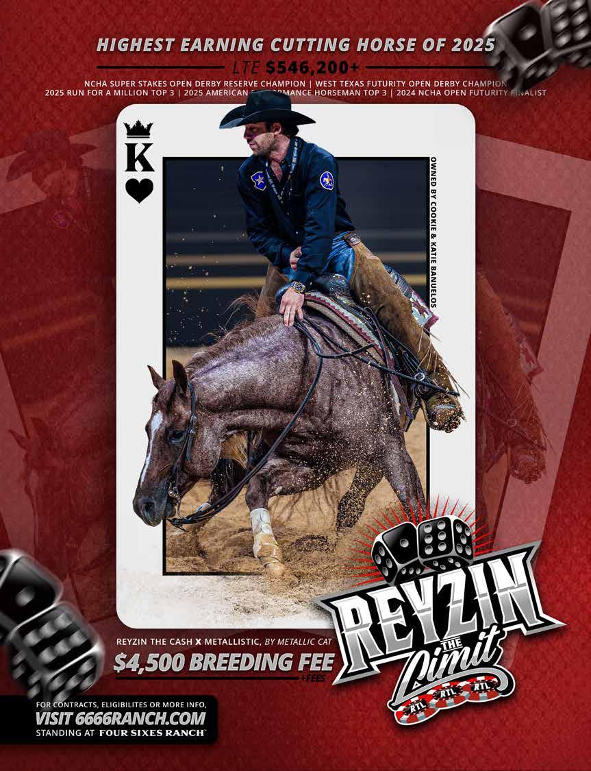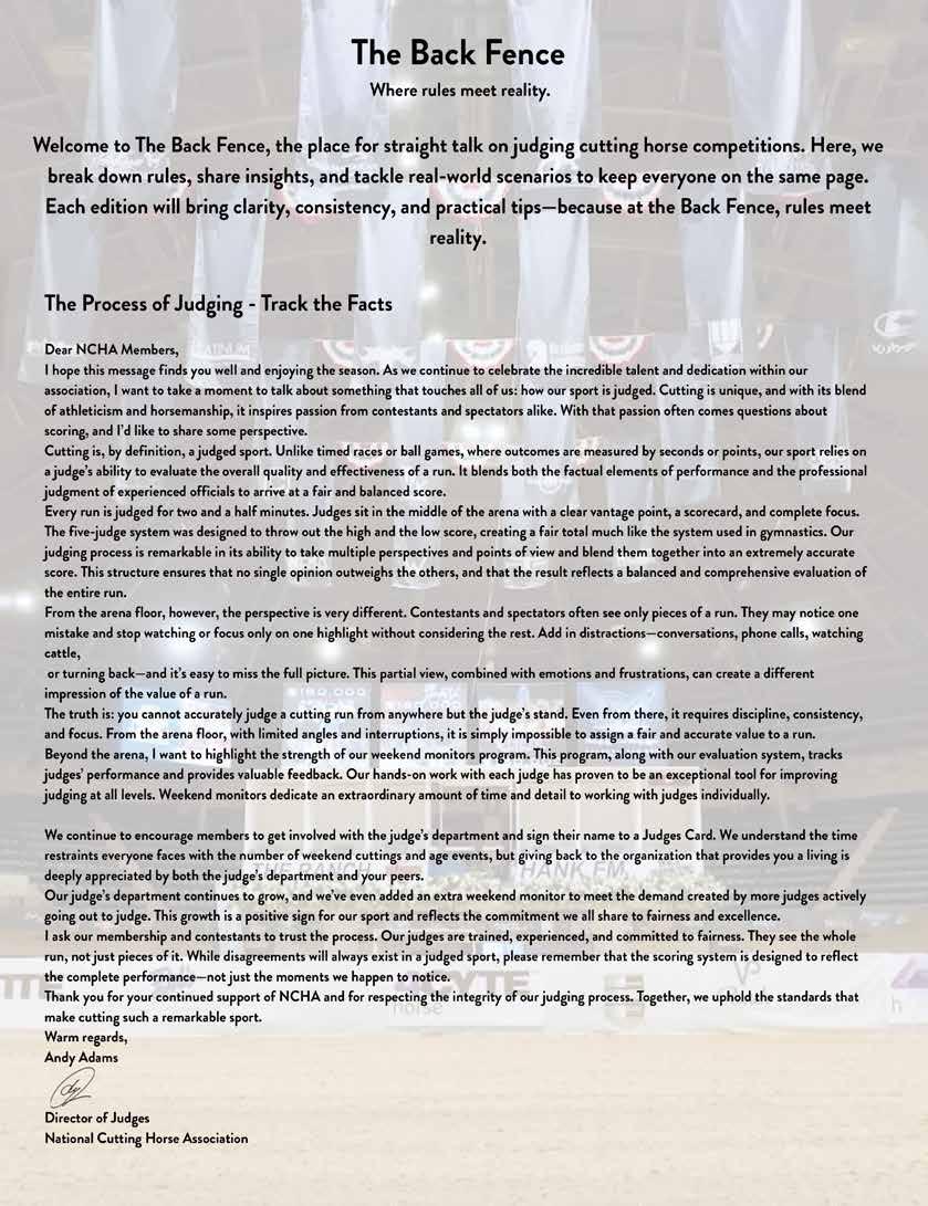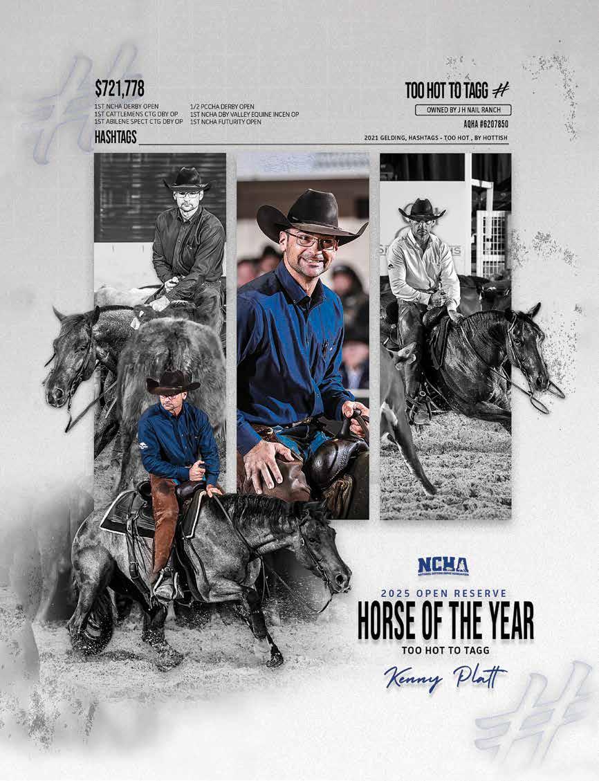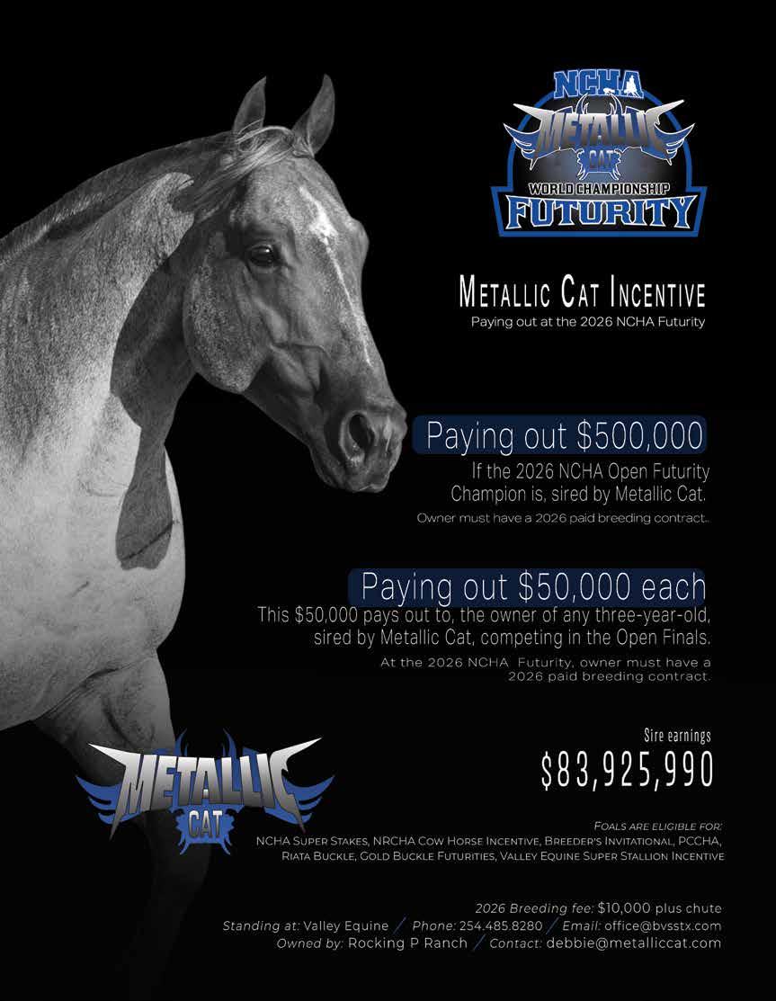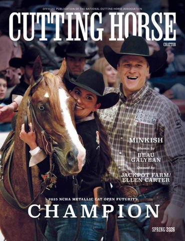 Iwant to congratulate the NCHA community on the tremendous success of the Metallic Cat World Championship Futurity. Once again, this premier event brought our cutting horse family together in a powerful and meaningful way, reinforcing that excellence is defined not by a venue but by the people, horses, and values that shape our industry. Despite operating in a temporary setting, the event was executed seamlessly, delivering world - class competition, electrical atmospheres, and performances that will be remembered for years to come. Throughout the month - long show, momentum continued to build, fueled in part by the outstanding success of the Western Bloodstock Sale. The sale reflected the strength, depth, and confidence of our industry, showcasing elite prospects backed by thoughtful breeding programs, proven horsemanship, and continued investment in the future of cutting horses. When faced with the challenges presented by Equine Herpesvirus (EHV),our members,exhibitors,veterinarians, and staff came together with a shared commitment to the health and safety of horses. Through cooperation, heightened biosecurity measures, and mutual respect, our community demonstrated leadership, responsibility, and an unwavering dedication to the well - being of the horse. Inside the show pen, competition reflected the very best of our sport. Beau Galyean captured the Metallic Cat World Championship Futurity title with a run that exemplified dedication, preparation, and trust between horse and rider. Cass Tatum earned the title of World Finals Open Champion, delivering performances marked by consistency, precision, and championship - level execution.