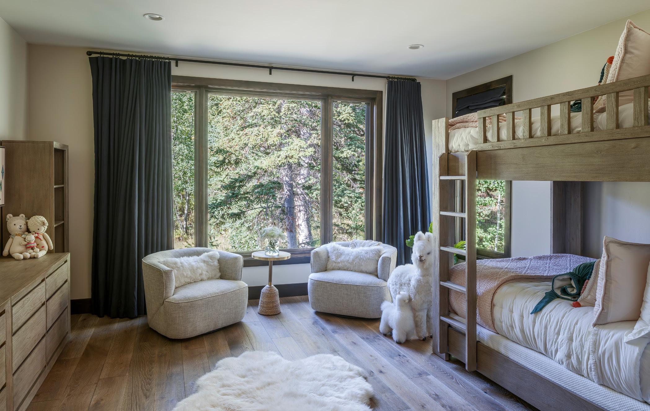 Expansive windows frame views of the surrounding aspens and ski mountain slopes, while the layout provides comfort and privacy for family and guests.