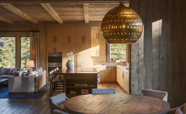 The main level serves as the heart of the home; expansive, light-filled, and thoughtfully composed floor-toceiling windows frame sweeping ski run and mountain views, while reclaimed Douglas Fir wood ceiling beams and boards add warmth and texture. At the center, a limestone fireplace with a granite facade and hearth creates a striking focal point, blending organic materials with architectural presence. The highly desirable open floor plan connects the great room to the dining area and gourmet chef’s kitchen, forming a comfortable and refined space for gathering. Here, evenings unfold around the crackling wood-burning fireplace, where family and friends come together to share stories, meals, and lasting memories.