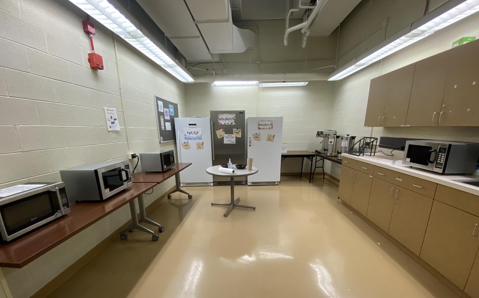 Ameni>es: 3 fridges, 4 microwaves, sink, utensils/cups/plates, countertop space, and coffee/hot water for tea in the mornings.