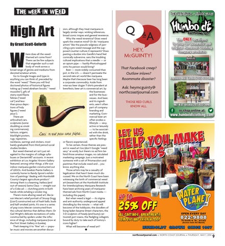 sion, although they treat marijuana in largely similar ways: winking references, broad comic tropes and general reverence. Why the weed reverence? Does weed spark the creative mind? Or do “marijuana artists” like the pseudo-edginess of penciling a pro-weed message and the supposed counter-culture it represents? Does pasting a doobie into Gandhi’s hand feel comically subversive, sans the troubling cultural implications that a needle — or an opium pipe — hastily Photoshopped onto his person would bring? Beer — more widely consumed than pot, in the U.S. — doesn’t permeate the second-rate art world like marijuana. Maybe that’s because beer has long been a corporate commodity. Aside from wise-ass beer slogan T-shirts prevalent at brewfests, beer art is commercial art, by the businesses and for the businesses. And beer, and its ingredients, aren’t often part of company branding and marketing. Commercial beer art often evokes a lifestyle — sexy, active or leisurely — to be associated with the drink, rather than the specific feelings or flavors experienced. To be certain, those themes are present in weed art too (don’t Google “weed sexy” at work), but there’s no ad firm behind those amateur images, no calculated marketing campaign. Just a motivated someone with a set of Prismacolors and pastimes that include weed and … you know, anything else. Those artists may be a casualty of legalization that hasn’t been much discussed. We on the North Coast have been witnessing the birth of commercial weed art (researchers at the Humboldt Institute for Interdisciplinary Marijuana Research have been archiving years of marijuanathemed ads from North Coast media — including this paper). But when weed is legal — its stigma and anti-authority underground appeal dwindling by the minute — what will become of the hobbyists, the doodlers of bong-laden Sesame Street characters, the 3-D sculptors of heady (and busty) cartoonish pot-vixens, the fledgling collagists bound by duty to take each of history’s icons higher? What will become of weed art? ●