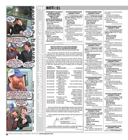 Claim forms and information regarding filing procedures may be obtained at the Humboldt County Tax Collector’s Office, 825 5th Street, Room 125, Eureka, CA 95501 or by calling (707) 476-2450 or toll free (877) 448-6829 between 8:30 am-Noon and 1:00pm-5:00pm, Monday through Friday. I certify or (declare), under penalty of perjury, that the foregoing is true and correct. _________________________________ John Bartholomew Humboldt County Tax Collector Executed at Eureka, Humboldt County, California, on April 26, 2013. Published in the North Coast Journal on May 2nd, May 9th, and May 16th, 2013. 5/2, 5/9, 5/16 (13-132)