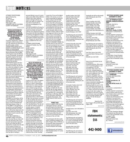 To all heirs, beneficiaries, creditors, contingent creditors and persons who may otherwise be interested in the will or estate, or both, STEPHEN PATRICK MILLER, ALSO KNOWN AS STEPHEN MILLER, ALSO KNOW AS STEVEN MILLER A PETITION FOR PROBATE has been filed by Petitioner, Gary M. Miller In the Superior Court of California, County of Humboldt. The petition for probate requests that Gary M. Miller be appointed as personal representative to administer the 8/13, 20, 27 (15−181) estate of the decedent. TS# 15−2172 NOTICE OF THE PETITION requests the dece− TRUSTEE’S SALE YOU ARE IN dent’s will and codicils, if any, be DEFAULT UNDER A DEED OF admitted to probate. The will and TRUST DATED: 7/13/09. UNLESS any codicils are available for exami− YOU TAKE ACTION TO nation in the file kept by court. PROTECT YOUR PROPERTY, IT THE PETITION requests authority to MAY BE SOLD AT A PUBLIC administer the estate under the SALE. IF YOU NEED AN EXPLA− Independent Administration of NATION OF THE NATURE OF Estates Act. (This authority will THE PROCEEDING AGAINST allow the personal representative to YOU, YOU SHOULD CONTACT take many actions without A LAWYER. obtaining court approval. Before A public auction sale to the highest taking certain very important bidder for cash, cashier’s check actions, however, the personal drawn on a state or national bank, representative will be required to check drawn by a state or federal give notice to interested persons credit union, or a check drawn by a unless they have waived notice or state or federal savings and loan consented to the proposed action.) association, or savings association, The independent administration or savings bank specified in Section authority will be granted unless an 5102 of the Financial Code and interested person files an objection authorized to do business in this to the petition and shows good state will be held by the duly cause why the court should not appointed trustee, as shown below, grant the authority. all right, title and interest conveyed A HEARING on the petition will be to and now held by the trustee in held on September 3, 2015 at 2:00 the hereinafter described property p.m. at the Superior Court of Cali− under and pursuant to a Deed of PUBLIC SALE fornia, County of Humboldt, 825 Trust described below. The sale will Fifth Street, Eureka, in Dept.: 8. NOTICE IS HEREBY GIVEN that the be made, but without covenant or IF YOU OBJECT to the granting of undersigned intends to sell the warranty, express or implied, the petition, you should appear at personal property described below regarding title, possession, or the hearing and state your objec− to enforce a lien imposed on said encumbrances, to satisfy the obli− tions or file written objections with property pursuant to Sections 21700 gation secured by said Deed of the court before the hearing. Your −21716 of the Business & Professions Trust. The undersigned Trustee appearance may be in person or by Code, Section 2328 of the UCC, disclaims any liability for any incor− your attorney. Section 535 of the Penal Code and rectness of the property address or IF YOU ARE A CREDITOR or a provisions of the civil Code. other common designation, if any contingent creditor of the dece− shown herein. Trustor: Scott dent, you must file your claim with The undersigned will sell at public Peterman and Kristen Peterman, the court and mail a copy to the sale by competitive bidding on the husband and wife as community personal representative appointed 26th of August, 2015, at 9:00 AM, on property with right of survivorship by the court within the later of the premises where said property Duly Appointed Trustee: Foreclo− either (1) four months from the date has been stored and which are sure Specialists LLC Recorded 8/11/ of first issuance of letters to a located at Rainbow Self Storage. 09 as Instrument No. 2009−18357−7 general personal representative, as of Official Records in the office of defined in section 58(b) of the Cali− The following units are located at the Recorder of Humboldt County, fornia Probate Code, or (2) 60 days 4055 Broadway Eureka, CA, County California, Date of Sale: Thursday, from the date of mailing or of Humboldt. September 3, 2015 at 10:30 AM Place personal delivery to you of a notice of Sale: on theAUG. steps20, to the under NORTH section 9052 of theJOURNAL California • THURSDAY, Jennifer Lenihan, Unit # 5013 COAST 2015front • northcoastjournal.com entrance to the County Courthouse, Probate Code. Other California Deborah Steele, Unit # 5217 825 5TH Street, Eureka, CA 95501 statutes and legal authority may Edwin Lady, Unit # 5247 The common designation of the affect your rights as a creditor. You Phoebe Morris, Unit # 5283 property is purported to be: 5345 may want to consult with an Andrea Printy, Unit # 5295 t
