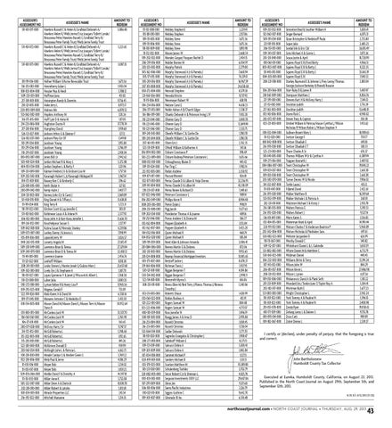 Amount to Assessor’s Assessee’s Name Assessment No redeem 511-431-071-000 Hawkins Russell C & Helen K/Lindblad Deborah A/ 3,086.48 Hawkins Helen K/Wells Jerrie/Cruz Joaquin/Tollett Lorale/ Brousseau Peter/Hawkins Russell C/Lindblad Terry R/ Brousseau Peter Family Trust/Wells Jerrie Family Trust 511-431-072-000 Hawkins Russell C & Helen K/Lindblad Deborah A/ 3,223.65 Hawkins Helen K/Wells Jerrie/Cruz Joaquin/Tollett Lorale/ Brousseau Peter/Hawkins Russell C/Lindblad Terry R/ Brousseau Peter Family Trust/Wells Jerrie Family Trust 511-431-073-000 Hawkins Russell C & Helen K/Lindblad Deborah A/ 3,087.35 Hawkins Helen K/Wells Jerrie/Cruz Joaquin/Tollett Lorale/ Brousseau Peter/Hawkins Russell C/Lindblad Terry R/ Brousseau Peter Family Trust/Wells Jerrie Family Trust 011-191-016-000 Hefner William V/Acme Revocable Trust 1,673.56 316-313-003-000 Henneberry Julian L 1,903.04 108-033-004-000 Hessler Nya & Heidi 3,788.12 509-233-031-000 Hoffman Jana 451.02 217-381-001-000 Hoisington Randy & Dawnita 9,756.45 218-121-005-000 Hoke Jerry L 8,973.17 220-092-009-000 Holmes Mir 6,870.52 533-062-002-000 Hopkins Anthony M 220.26 316-175-015-000 Huff Lyle D & Anita M 1,117.05 214-233-006-000 Hughston Dustin R 17,770.74 217-281-016-000 Humphrey David 1,939.68 526-121-027-000 Jackson Athos G & Eleanor F 127.12 526-102-037-000 Jackson Pliny Est Of 1,549.18 110-291-034-000 Jacobsen Young 1,915.08 110-291-036-000 Jacobsen Young 3,746.09 110-291-037-000 Jacobsen Young 2,901.04 010-092-007-000 Jones Bill I Jr 2,942.62 503-401-024-000 Jordan Michael R & Mary L 5,372.88 404-051-034-000 Jordan Stephen L & Betty F 3,121.96 109-331-009-000 Kalman Fredrick J Ii & Erickson Lisa M 1,737.50 109-202-043-000 Kavanagh Hubert L Jr/Kavanagh Hildegard R 3,967.14 014-173-001-000 Keasey Ken C & Kimberly C 296.62 220-081-005-000 Keith Skylar A 327.02 200-091-042-000 Kemp Aubri J 3,407.77 204-331-003-000 Kenney John E Jr & Carol J 1,069.89 511-450-015-000 King Daniel H & Tiffany L 11,638.81 111-191-034-000 King Terry R 3,723.31 110-191-023-000 Kitchen Scott & Lay Jennifer E 303.01 511-431-063-000 Kohlmeier Louis A & Arlene N 2,577.92 306-102-001-000 Kooy John A & Karr-Kooy Jennifer L 13,636.70 109-261-032-000 Kouchekpour Sassan S 2,127.97 109-042-018-000 Kutina Susan K/Nivinsky Stanley 4,239.86 509-073-007-000 Lackey Danny J & Jessica L 7,198.99 105-091-036-000 Lapacek Jerry W 3,026.57 040-263-015-000 Lavanty Angela M 27,615.47 509-201-049-000 Lawrence Brian & Teresa 27,329.84 509-240-070-000 Lawrence Brian D & Teresa M 22,430.12 111-141-001-000 Lawrence Joanne 2,456.76 111-121-022-000 Lenhoff William 8,118.38 208-241-001-000 Lesko Steven L/Hunter Jonah S/Gulizio Marc J 23,657.68 109-302-010-000 Lively Eric J & Stephanie A 3,107.70 110-101-027-000 Lopez Epimenio V & Janet J/Wiscovitch Albert L 1,768.58 110-121-008-000 Luber Julia 1,800.55 010-272-018-000 Lyman Kellee R & Henry Lisa P 11,965.56 109-292-025-000 Mageau Gerald F 733.09 522-391-026-000 Maki Karen A & David M 6,550.16 109-171-045-000 Manares Antonio C & Medelita O 2,413.30 010-154-005-000 Maxon David M/Maxon David L/Maxon Terri A/Maxon 30,952.64 Travis R 031-085-015-000 McCanless Jack W 33,537.70 106-061-061-000 McCanless Jack W 2,765.90 106-171-011-000 McCanless Jack W 363.65 200-071-028-000 McEvoy Harry J Sr 11,747.37 314-172-012-000 McGill Roberta L 3,748.60 315-202-005-000 McGill Roberta L 1,192.65 315-203-001-000 McGill Roberta L 841.26 522-381-040-000 McKinnon Donald D 959.99 203-061-034-000 McKnight John L & Patricia L 6,162.73 100-281-030-000 Meade Carolyn S & Mesher Gwen S 3,769.22 052-281-006-000 Mela Paul & Jerrie 4,186.29 111-051-016-000 Meyer Bob 1,234.02 111-051-017-000 Meyer Bob 1,059.25 509-076-006-000 Mielke David F & Dorothy A 14,397.10 111-151-055-000 Miller Anne K 3,732.08 505-322-007-000 Miller Drew A & Dietrich 10,100.78 202-281-010-000 Miller Robert & Latisha 5,013.81 001-034-001-000 Miracle Properties LLC 243.54 216-392-022-000 Mitchell Marianne 1,214.35