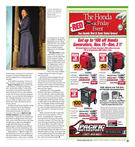 on Sunday, Dec. 8. Tickets are available at Wildberries Marketplace or by calling (707) 822-1575. You can find more information including a schedule of guest appearances at arcataplayhouse.org. The Music Man by Meredith Wilson (script and songs) is the Ferndale Repertory Theatre’s holiday show, though probably not because Wilson also wrote “It’s Beginning to Look A lot Like Christmas.” It’s a big, bright musical from Broadway’s Golden Age, with a love story, children, a happy ending and songs you sing on your way home. Directed by Dianne Zuleger, the cast of 30 is led by Jaison Chand as the con man Professor Harold Hill and Caitlin McMurtry as his love interest, Marian the Librarian, and includes Gino Bloomberg, Greta Stockwell, Anders Carlson, Laura Rose and Tyler Egerer. Linda Maxwell is choreographer, Elisabeth Harrington and Nanette Voss are vocal directors, Karen Kenfeld Fuller is costume coordinator, and Bruce Keller scenic artist, with sound by Ian Schatz and lighting by Telfer Reynolds. The Music Man opens at Ferndale Rep on Friday Nov. 29, and plays Fridays and Saturdays at 8 p.m., Sundays at 2 p.m. through Dec. 22, with Thursday night performances on Dec. 12 (benefit for cast and crew) and Dec. 19. While “(Ya Got) Trouble” (“right here in River City”) and “Seventy-six Trombones” are probably the songs most associated with the show, the tuneful score also includes “Till There Was You,” most famously recorded by the Beatles in the early 1960s. They didn’t know it came from The Music Man, but Paul McCartney (who sang it solo) found out— and eventually bought the rights to all of Meredith Wilson’s songs. So it seems that some royalties will go from Ferndale right on over to Sir Paul. Merry Christmas to him, and to all, and good night. l
