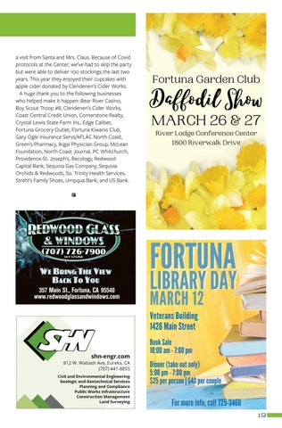 a visit from Santa and Mrs. Claus. Because of Covid protocols at the Center, we’ve had to skip the party but were able to deliver 100 stockings the last two years. This year they enjoyed their cupcakes with apple cider donated by Clendenen’s Cider Works. A huge thank you to the following businesses who helped make it happen: Bear River Casino, Boy Scout Troop #8, Clendenen’s Cider Works, Coast Central Credit Union, Cornerstone Realty, Crystal Lewis State Farm Ins., Edge Caliber, Fortuna Grocery Outlet, Fortuna Kiwanis Club, Gary Ogle Insurance Servs/AFLAC North Coast, Green’s Pharmacy, Ikigai Physician Group, McLean Foundation, North Coast Journal, PC Whitchurch, Providence-St. Joseph’s, Recology, Redwood Capital Bank, Sequoia Gas Company, Sequoia Orchids & Redwoods, So. Trinity Health Services, Strehl’s Family Shoes, Umpqua Bank, and US Bank.