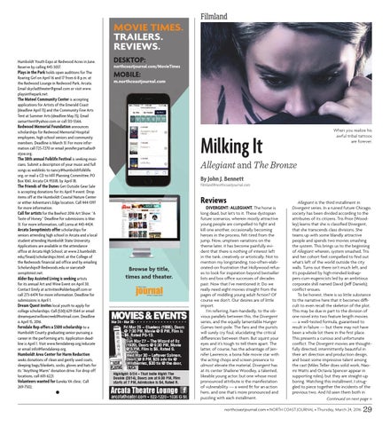 MOVIE TIMES. TRAILERS. REVIEWS. Humboldt Youth Expo at Redwood Acres in June. Reserve by calling 445-3037. Plays in the Park holds open auditions for The Roaring Girl on April 16 and 17 from 6-8 p.m. at the Redwood Lounge in Redwood Park, Arcata. Email skycladtheater@gmail.com or visit www. playsinthepark.net. The Mateel Community Center is accepting applications for Artists of the Emerald Coast (deadline April 15) and the Community Fine Arts Tent at Summer Arts (deadline May 15). Email samarttent@yahoo.com or call 513-5566. Redwood Memorial Foundation announces scholarships for Redwood Memorial Hospital employees, high school seniors and community members. Deadline is March 31. For more information call 725-7270 or email jennifer.partsafas@ stjoe.org. The 38th annual Folklife Festival is seeking musicians. Submit a description of your music and full songs as weblinks to nancy@humboldtfolklife. org, or mail a CD to HFF Planning Committee, PO Box 1061, Arcata CA 95518, by April 18. The Friends of the Dunes Get Outside Gear Sale is accepting donations for its April 9 event. Drop items off at the Humboldt Coastal Nature Center or either Adventure’s Edge location. Call 444-1397 for more information. Call for artists for the BeeFest 2016 Art Show: “A Taste of Honey.” Deadline for submissions is Mar. 31. For more information, call Lorna at 443-4424. Arcata Soroptimists offer scholarships for seniors attending high school in Arcata and a local student attending Humboldt State University. Applications are available in the attendance office at Arcata High School, at www.2.humboldt. edu/finaid/scholarships.html, at the College of the Redwoods financial aid office and by emailing Scholarships@ Redwoods.edu or siarcata@ soroptimist.net. Alder Bay Assisted Living is seeking artists for its annual Art and Wine Event on April 30. Contact Emily at activities@alderbayalf.com or call 273-6474 for more information. Deadline for submissions is April 1. Dream Quest invites local youth to apply for college scholarships. Call (530) 629-3564 or email dreamquestwillowcreek@hotmail.com. Deadline is April 15, 2016. Ferndale Rep offers a $500 scholarship to a Humboldt County graduating senior pursuing a career in the performing arts. Application deadline is April 1. Visit www.ferndalerep.org/educate or email info@ferndalerep.org. Humboldt Area Center for Harm Reduction seeks donations of clean and gently used coats, sleeping bags/blankets, socks, gloves and hats for its “Anything Warm” donation drive. For drop off locations, call 601-6221. Volunteers wanted for Eureka VA clinic. Call 269-7502. l