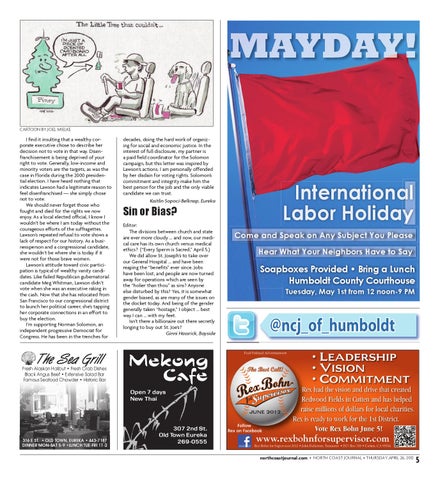 decades, doing the hard work of organizing for social and economic justice. In the interest of full disclosure, my partner is a paid field coordinator for the Solomon campaign, but this letter was inspired by Lawson’s actions. I am personally offended by her disdain for voting rights. Solomon’s commitment and integrity make him the best person for the job and the only viable candidate we can trust. Kaitlin Sopoci-Belknap, Eureka