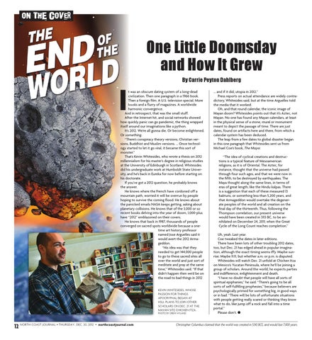 t was an obscure dating system of a long-dead civilization. Then one paragraph in a 1966 book. Then a foreign film. A U.S. television special. More books and a flurry of magazines. A worldwide harmonic convergence. And in retrospect, that was the small stuff. After the Internet hit, and social networks showed how quickly panic can go pandemic, the thing wrapped itself around our imaginations like a python. It’s 2012. We’re all gonna die. Or become enlightened. Or something. “There’s conspiracy theory versions, Christian versions, Buddhist and Muslim versions. … Once technology started to let it go viral, it became this sort of monster.” That’s Kevin Whitesides, who wrote a thesis on 2012 millennialism for his master’s degree in religious studies at the University of Edinburgh in Scotland. Whitesides did his undergraduate work at Humboldt State University, and he’s back in Eureka for now before starting on his doctorate. If you’ve got a 2012 question, he probably knows the answer. He knows where the French have cordoned off a mountain path, worried it will be overrun by people hoping to survive the coming flood. He knows about the panicked emails NASA keeps getting, asking about planetary collisions. He knows that of the 3,000 or so recent books delving into the year of doom, 1,000-plus have “2012” emblazoned on their covers. He knows that back in 1987, thousands of people converged on sacred spots worldwide because a onetime art history professor named Jose Arguelles said it would avert the 2012 Armageddon. “His idea was that they needed to get 144,000 people to go to these sacred sites all over the world and just sort of meditate and pray at the same time,” Whitesides said. “If that didn’t happen then we’d be on the road to bad things in 2012 KEVIN WHITESIDES, WHOSE PASSION FOR THINGS APOCRYPHAL BEGAN AT HSU, PLANS TO JOIN OTHER SCHOLARS ON DEC. 21 AT THE MAYAN SITE CHICHEN ITZA. PHOTO BY DREW HYLAND