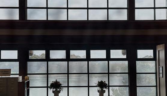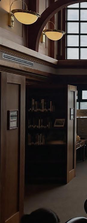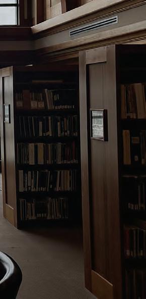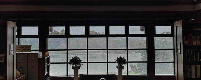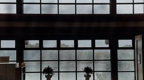 a dramatic frame for a path toward a wall of glass that overlooks the natural beauty of the bay, surrounded by shelves of historic books.