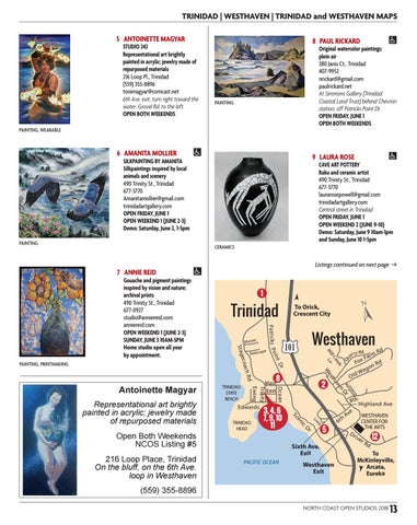 Gouache and pigment paintings inspired by vision and nature; archival prints 490 Trinity St., Trinidad 677-0927 studio@anniereid.com anniereid.com OPEN WEEKEND 1 (JUNE 2-3) SUNDAY, JUNE 3 10AM-5PM Home studio open all year by appointment.