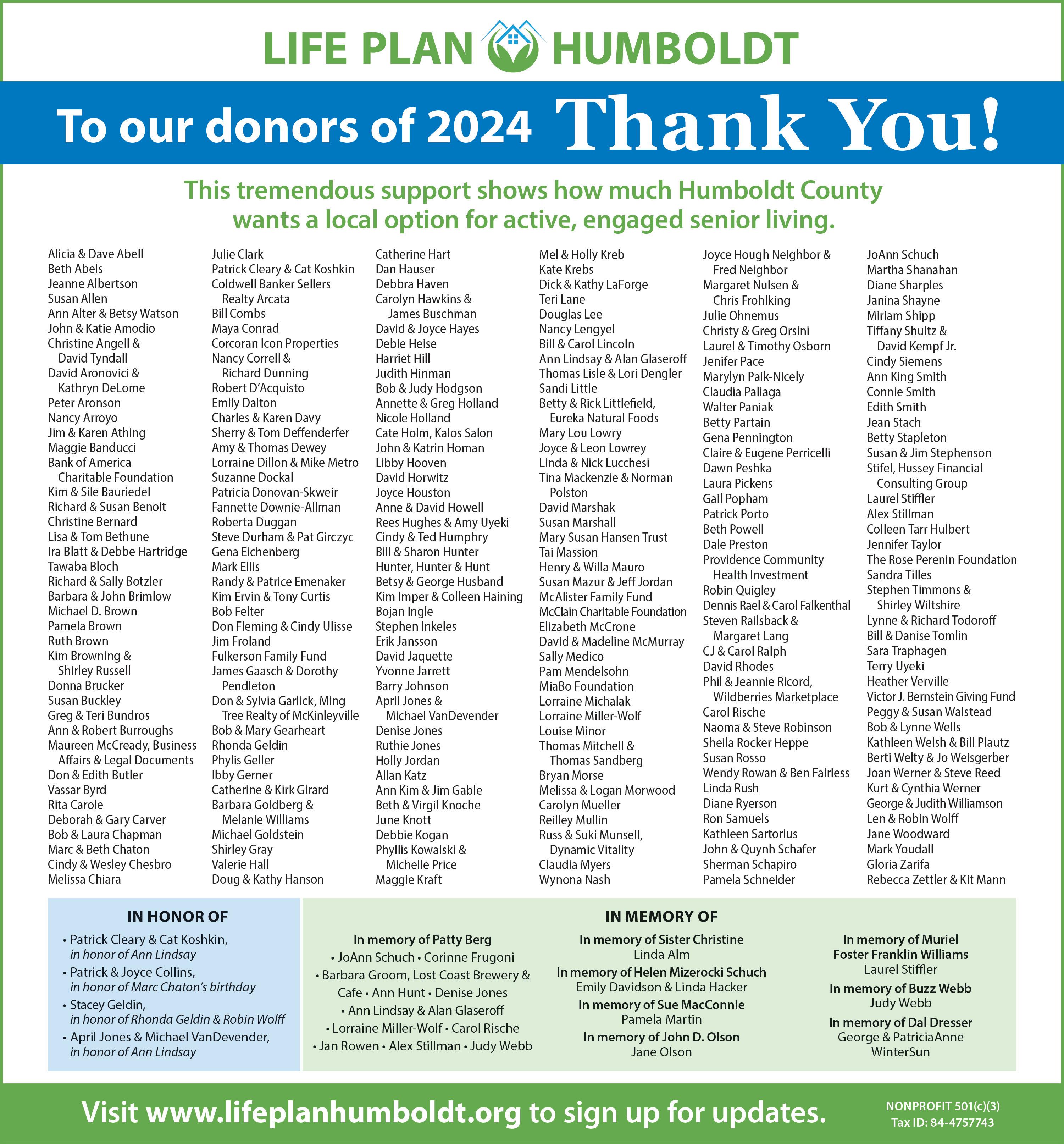Remembered as a fierce advocate for seniors who spearheaded the state’s firstof-its-kind master plan on aging, Berg was born and raised in Seattle and moved to Humboldt County in 1974 and made it her home. She was influential in the startup of the Humboldt Senior Resource Center in 1975 and worked in the county Public Health Department, where she helped develop the state’s first comprehensive K-12 family life and sex education curriculum for public schools. Berg founded the Area 1 Agency on