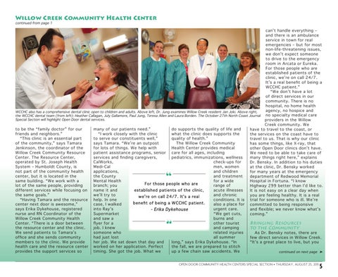 canât handle everything â and there is an ambulance service in town for real emergencies â but for most non-life-threatening issues, we donât expect someone to drive to the emergency room in Arcata or Eureka. For those people who are established patients of the clinic, weâre on call 24/7. Itâs a real beneďŹt of being a WCCHC patient.â âWe donât have a lot of direct services in our community. There is no hospital, no home health agency, no hospice and WCCHC also has a comprehensive dental clinic open to children and adults. Above left, Dr. Jung examines Willow Creek resident Jan Joki. Above right, the WCCHC dental team (from left): Heather Callagan, July Gallamore, Paul Jung, Teresa Allen and Laura Borden. The October 27th North Coast Journal no specialty medical care Special Section will highlight Open Door dental services. providers in the Willow Creek community. We do supports the quality of life and to be the âfamily doctorâ for our many of our patients need.â have to travel to the coast, or what the clinic does supports the friends and neighbors.â âI work closely with the clinic the services on the coast have to quality of health.â âThis clinic is an essential part to serve our constituents well,â travel to us. That is why our clinic The Willow Creek Community of the community,â says Tamara says Tamara. âWeâre an outpost has some things, like X-ray, that Health Center provides medical Jenkinson, the coordinator of the for lots of things. We help with other Open Door clinics donât have. Willow Creek Community Resource patient assistance programs, senior care for all ages, including We need to be able to take care of pediatrics, immunizations, wellness Center. The Resource Center, services and ďŹnding caregivers, many things right here,â explains check-ups for operated by St. Joseph Health CalWorks, Dr. Bensky. In addition to his duties men, women System â Humboldt County, is Medi-Cal at the clinic, Dr. Bensky worked and children not part of the community health applications, for many years at the emergency and treatment center, but it is located in the the County department of Redwood Memorial for a wide same building. âWe work with a Mental Health Hospital in Fortuna. âI know For those people who are range of lot of the same people, providing branch; you Highway 299 better than Iâd like to. established patients of the clinic, acute illnesses different services while focusing on name it and It is not easy on a clear day when and chronic the same goals.â weâll try to you are feeling healthy. It is a real weâre on call 24/7. Itâs a real conditions. It is trial for someone who is ill. Weâre âHaving Tamara and the resource help. In one beneďŹt of being a WCCHC patient. also a place for committed to being responsive center next door is awesome,â case, I walked urgent care. says Erika Dykehouse, registered into Rayâs and ďŹexible; we never know whatâs - Erika Dykehouse âWe get cuts, nurse and RN Coordinator of the Supermarket coming.â burns and Willow Creek Community Health and saw a other tourist Center. âThere is a door between ďŹyer for a Bringing Resources and camping the resource center and the clinic. job. I knew to the Community related injuries We send patients to Tamaraâs someone who As Dr. Bensky notes, there are all summer ofďŹce and she sends community had just lost few direct services in Willow Creek. long,â says Erika Dykehouse. âIn members to the clinic. We provide her job. We sat down that day and âItâs a great place to live, but you the fall, we are prepared to stitch health care and the resource center worked on her application. Perfect up a few chain saw accidents. We provides the support services so timing. She got the job. What we continued on next page â¤