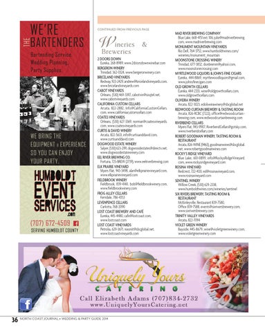 2 DOORS DOWN Eureka, 268-8989, www.2doorsdownwinebar.com BERGERON WINERY Trinidad, 362-0324, www.bergeronwinery.com BRICELAND VINEYARDS Redway, 923-2429, andrew@bricelandvineyards.com, www.bricelandvineyards.com CABOT VINEYARDS Orleans, (530) 469-3397, cabotvin@sisqtel.net, www.cabotvineyards.com CALIFORNIA CUSTOM CELLARS Arcata, 822-2882, Info@CaliforniaCustomCellars. com, www.californiacustomcellars.com COATES VINEYARDS Orleans, (530) 627-3369, norman@coatesvineyards. com, www.coatesvineyards.com CURTIS & DAVID WINERY Arcata, 822-5633, info@curtisanddavid.com, www.curtisanddavid.com DOGWOOD ESTATE WINERY Salyer, (530) 623-2191, dogwoodestates@directv.net, www.dogwoodestatewinery.com EEL RIVER BREWING CO. Fortuna, 725-BREW (2739), www.eelriverbrewing.com ELK PRAIRIE VINEYARD Myers Flat, 943-3498, alan@elkprairievineyard.com, www.elkprairievineyard.com FIELDBROOK WINERY Fieldbrook, 839-4140, bob@fieldbrookwinery.com, www.fieldbrookwinery.com FROG ALLEY CELLARS Ferndale, 786-4353 LEVENPENCE CELLARS Carlotta, 768-2090 LOST COAST BREWERY AND CAFÉ Eureka, 445-4480, cafe@lostcoast.com, www.lostcoast.com LOST COAST VINEYARDS Petrolia, 629-3671, nixonit@sbcglobal.net, www.lostcoastvineyards.com