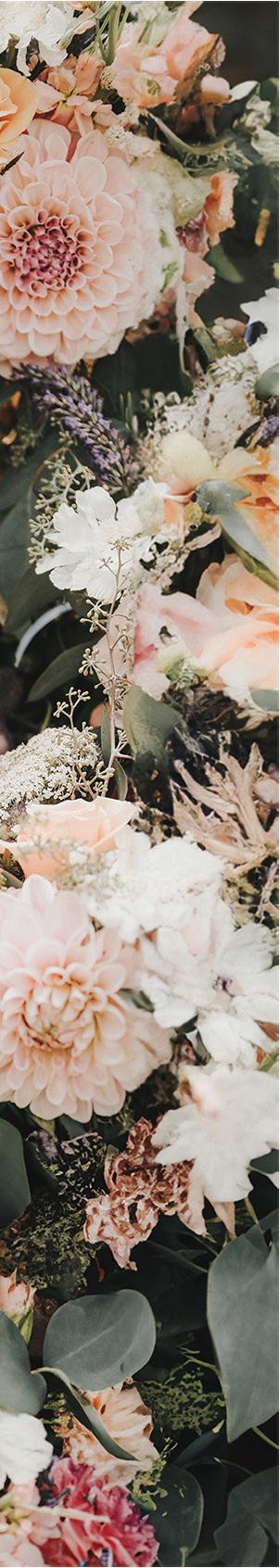 the unique look of the bridal bouquet, a romantic flowery arch framing the couple, sweet, fresh scents wa ing from the table arrangements. And who doesn’t love rose petals strewn down the aisle by a wide-eyed flower girl? Whether pastels or jewel tones, featuring traditional roses or something unexpected like herbs and textured greenery, florals set the theme. “Bridal bouquets are very personal,” said Reynolds. A reliable florist who values your vision and is able to make it more than you imagined is key to a successful wedding event.