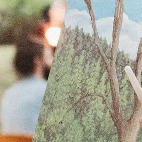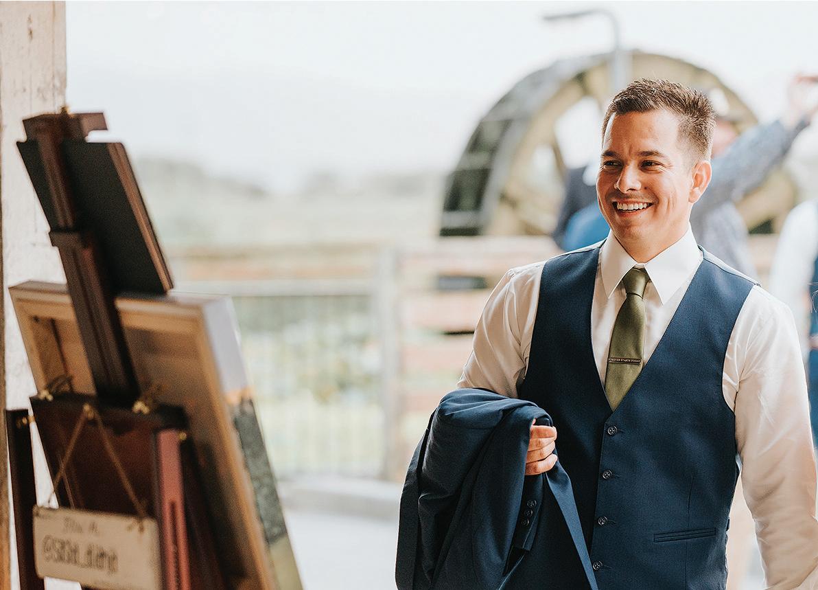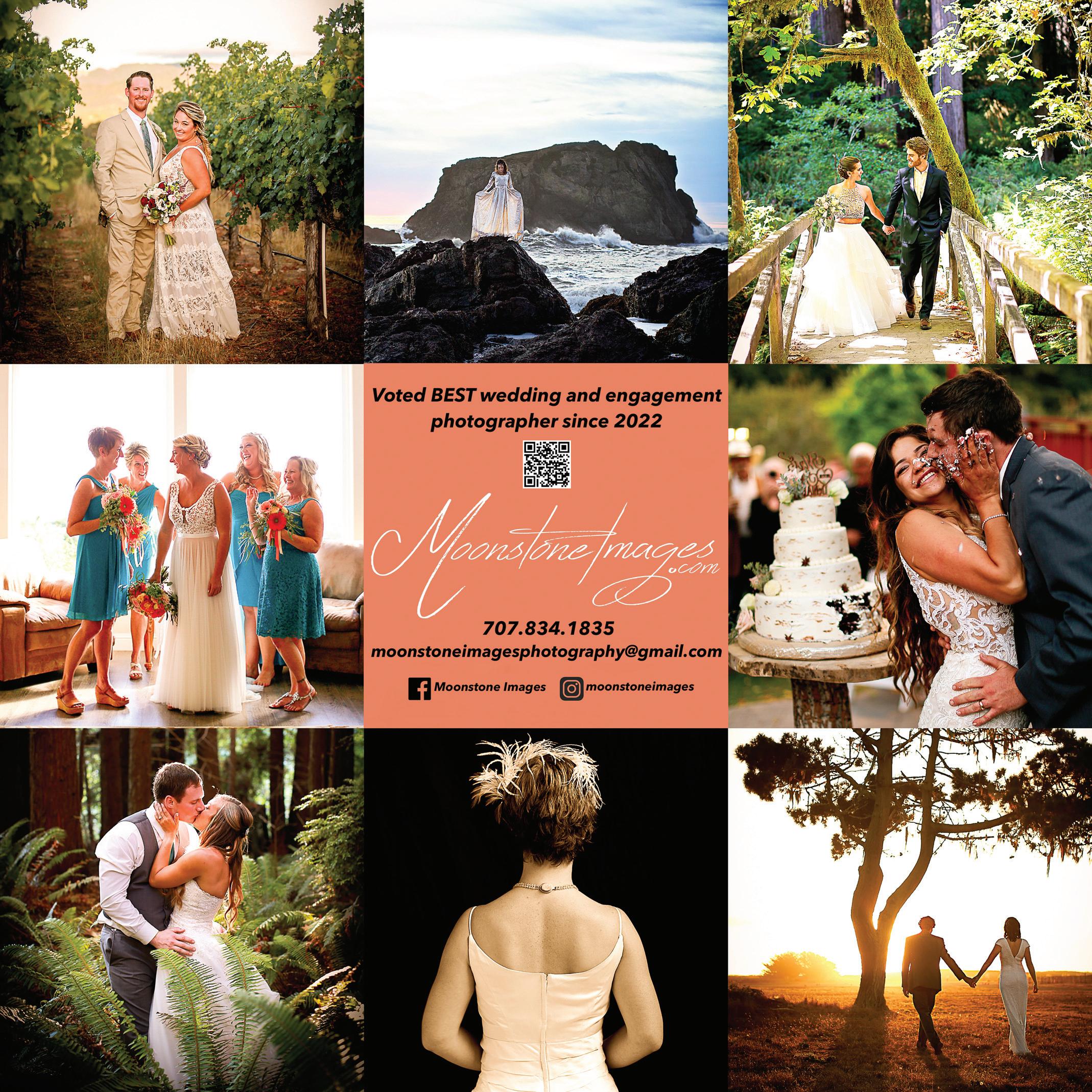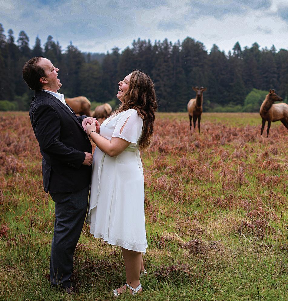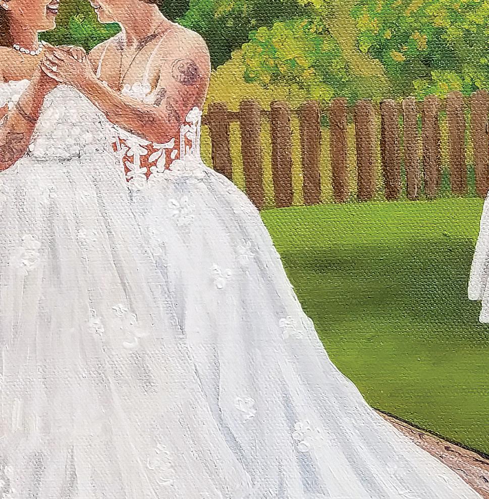 A client starts by filling out the contact form on Lyth’s website. They will have a consultation before the wedding day to determine details. That’s when Lyth gets a “vibe” for her client and the kind of aesthetic the ceremony will have. She and the client will decide on the background and what moment they want to capture. In this way, the portrait can capture more than a snapshot, representing the whole event and what it means to the people ge ing married. Lyth will come two to four hours early on the wedding day to set up somewhere guests can watch her work without being disruptive. Then she gets the background started. Guests are encouraged to watch her and ask questions. Children especially seem entranced by watching someone painting. She is happy to talk and explain the process, having had years of experience as the art teacher at Redwood Coast Mon-
