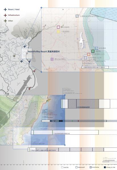 衝在最前頭的美麗灣渡假村,似乎集所有的罪惡於一 身。東縣政府球員兼裁判開始的BOT案,在沙灘上的 五層樓量體與泳池,完美落成的建物閒置至今,無法 營業是強推硬蓋後的下場。其所爆發的一連串爭議, 以及逐漸不復以往的經濟、市場,使得周遭這些對美 好未來的理想,至今仍是理想。
