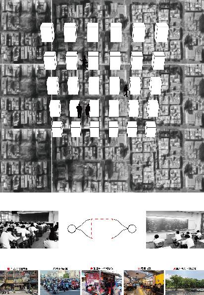 觀察基地中的人,目標鎖定在處於學習階段的國高中 生,他們一天的生活幾乎都在封閉空間度過,一天當 中會與城市有連結的時刻便是放學後到補習前間,他 們會進入社區的沿街面消費、社交,然後再度回到補 習班的密閉空間。