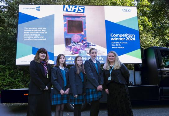 In response to the competition brief, the three girls created an innovative information vending machine dispensing facts and figures, as well as a short film, to raise awareness of the benefits of working as a ‘dramatherapist’ within the NHS. They were presented with the award by Annie Laverty, Director of Patient and Staff Experience at Newcastle Hospitals, at a special school presentation event. After this the pupils’ achievement and their winning film was displayed on a giant DigiVan