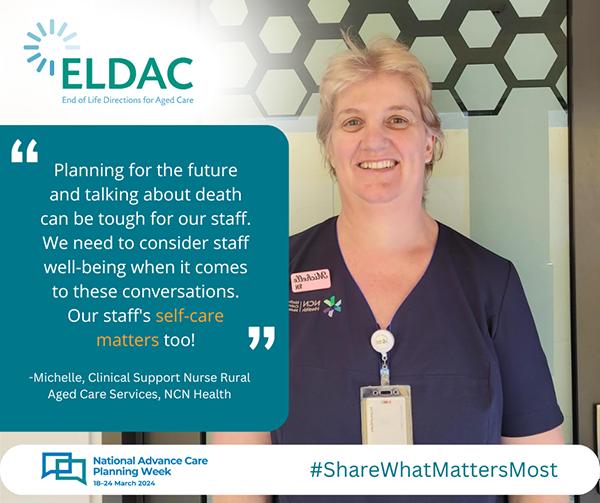 Michelle was recently profiled on the ELDAC (End of Life Directions for Aged Care) website as part of Advance Care Planning Week. We had a quick chat to Michelle this week to find out what makes her tick.