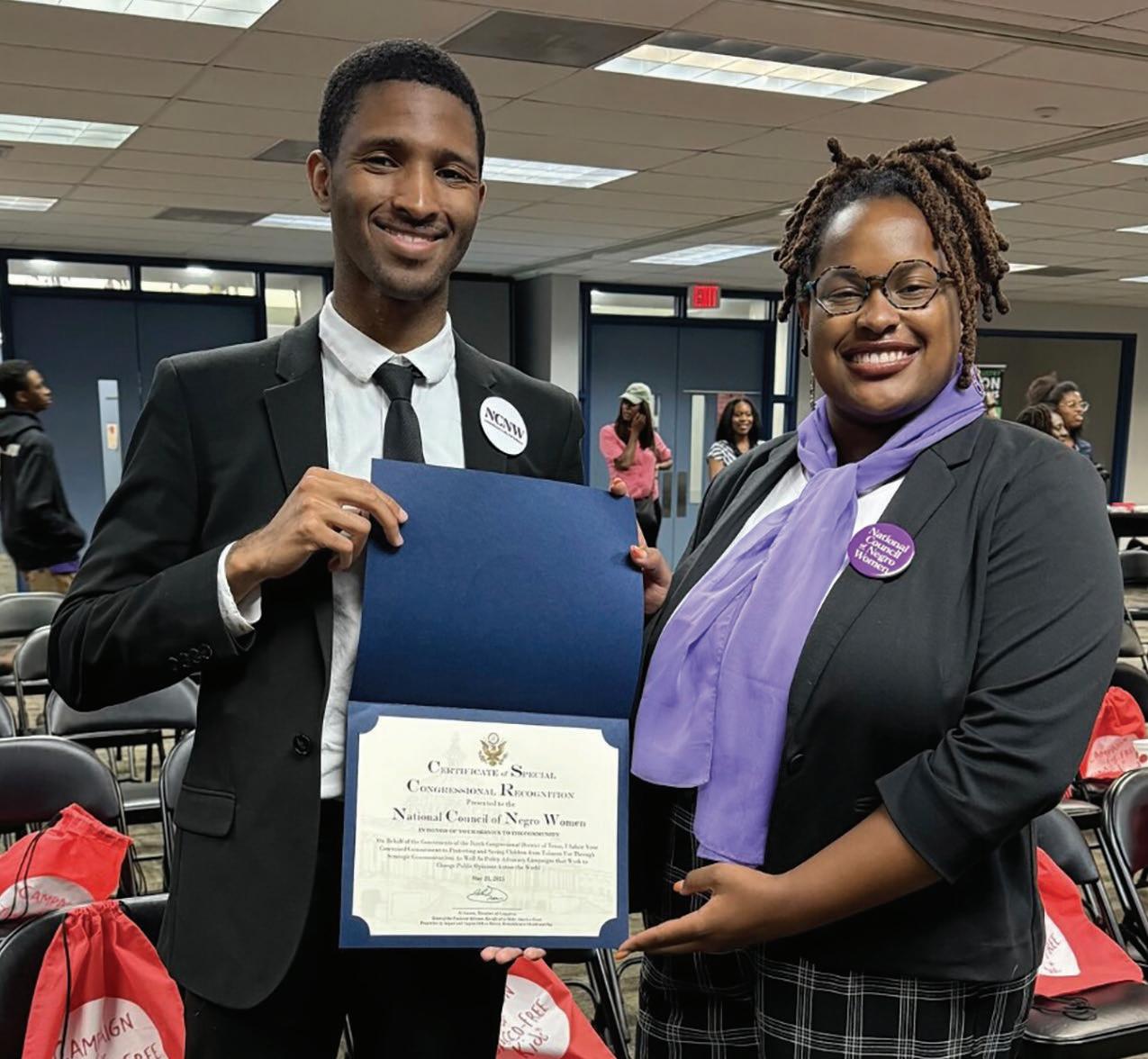 Federal and State Advocacy Managers, Tyese Williams and Micah Jumpp, respectively, pictured in Houston, Texas receiving a Certification of Special Congressional Recognition on behalf of NCNW. This award was presented by the office of Representative Al Green (TX-09).
