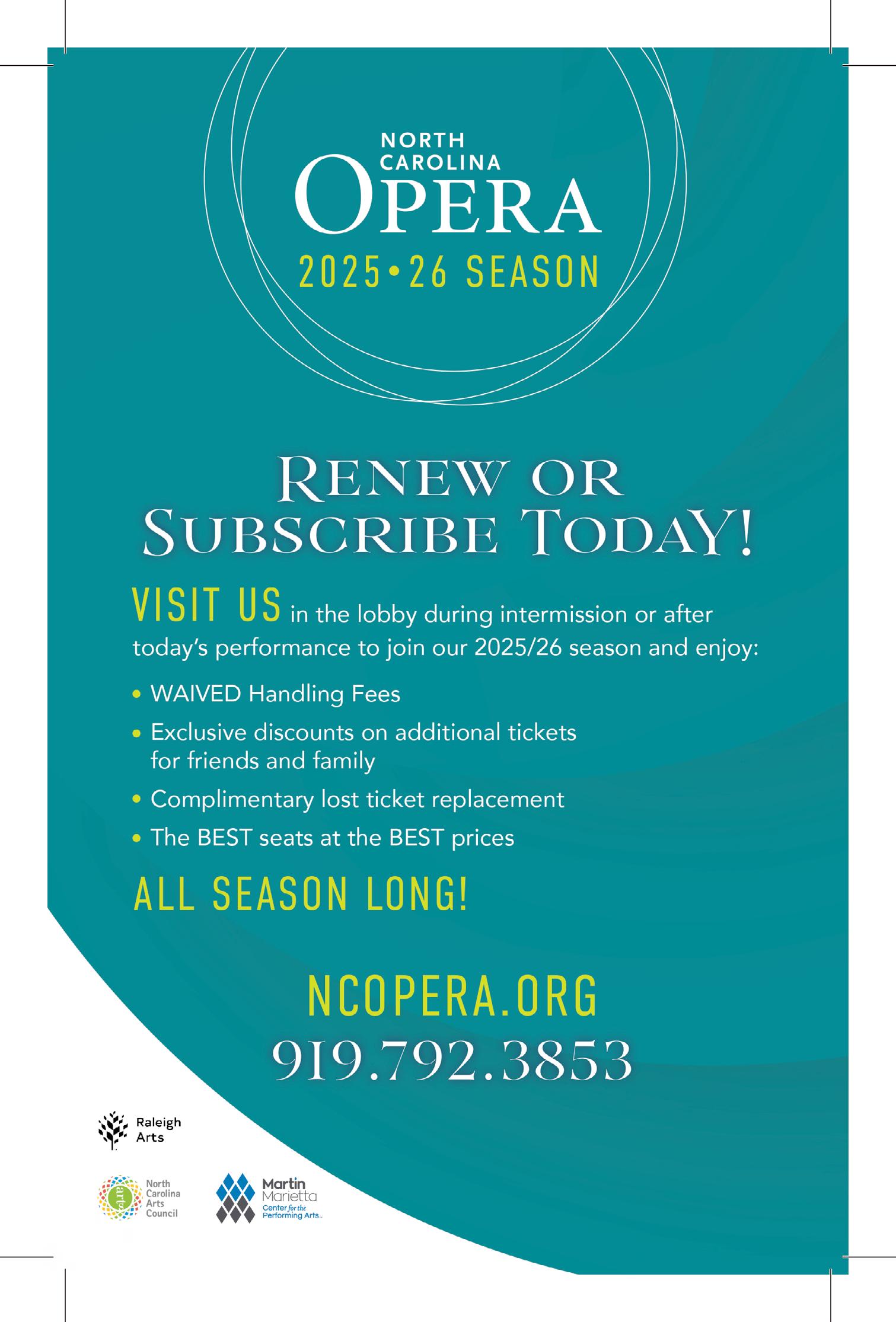 We are very grateful to all of you whose donations to North Carolina Opera make these performances possible. A gift of any size helps keep us singing. Thank you!